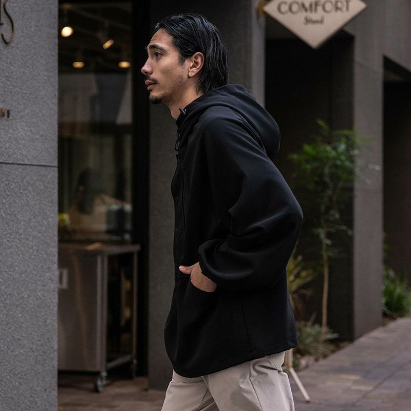 フードと裾部分にドローコードを完備し、シルエットをアレンジできるだけでなく防風性を高めます。