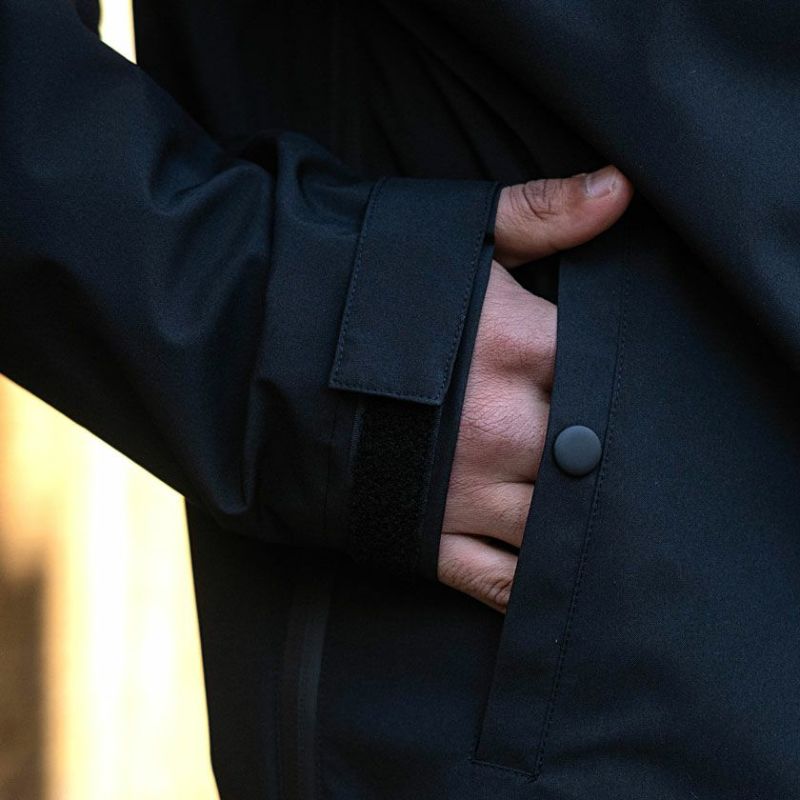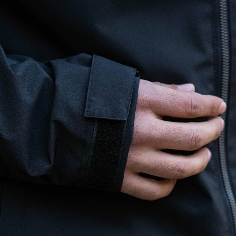 首元はハイネック、袖口はベロクロテープでご自分の手首サイズにフィット、裾口はスピンドルで絞ることが可能で、秋~春に対応いただける防寒仕様です。