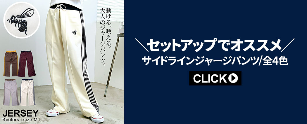 同デザインのパンツと合わせれば、存在感抜群のセットアップスタイルが完成。