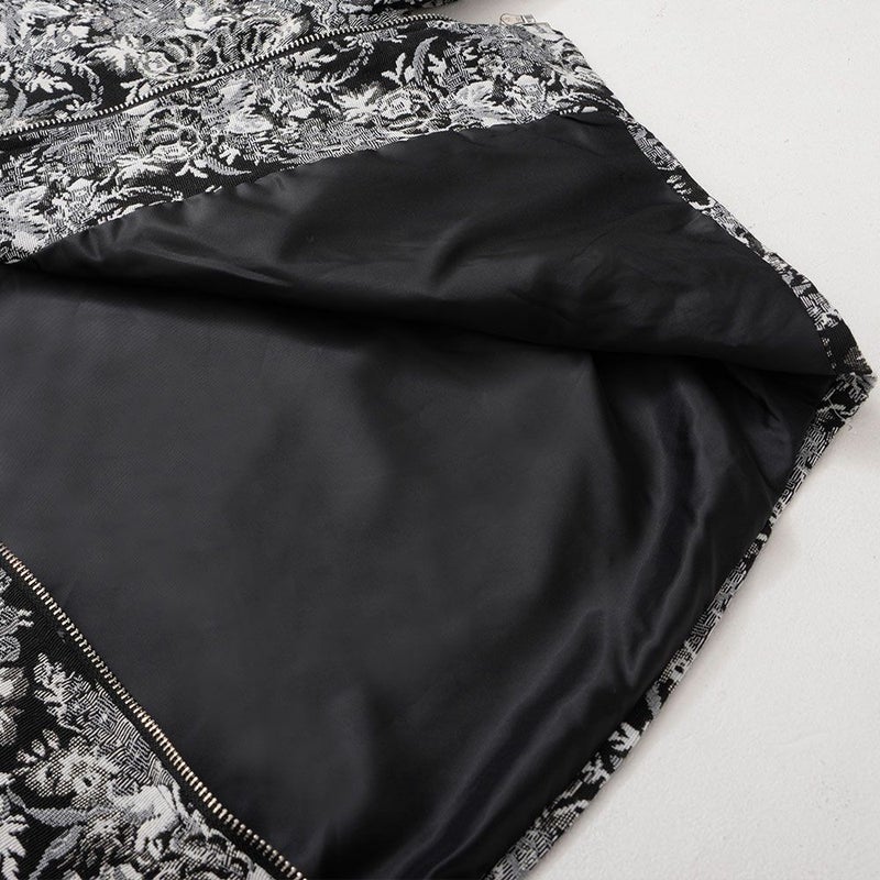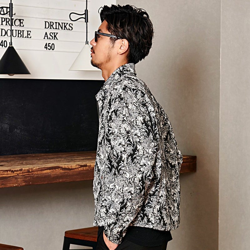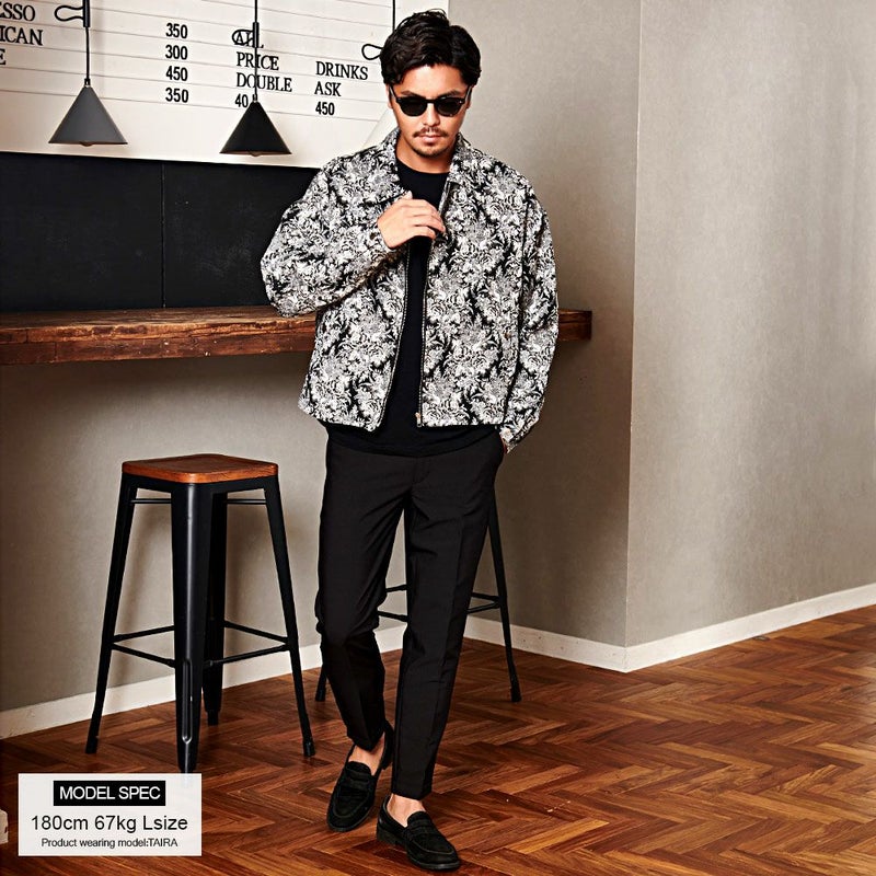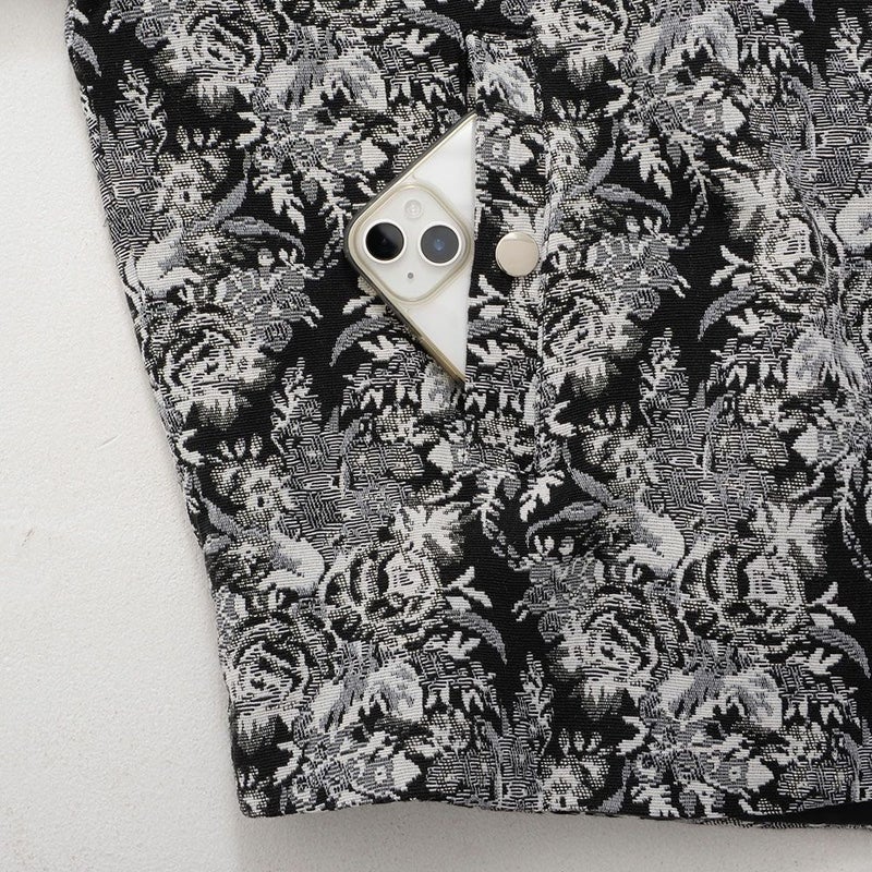 クラシックな花柄とショート丈の組み合わせが、着こなしに奥行きを生み出す一着。