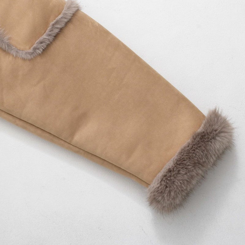 表側には毛足のあるふわふわのボア素材を使用し、暖かさとシーズンムードをしっかり演出。