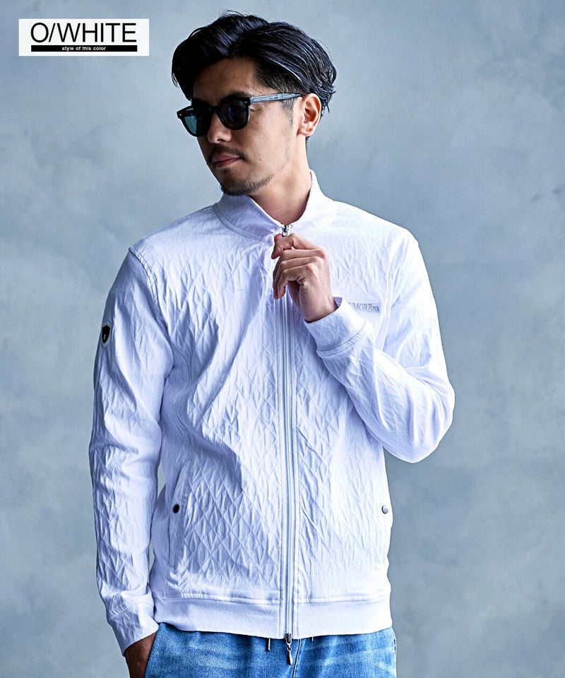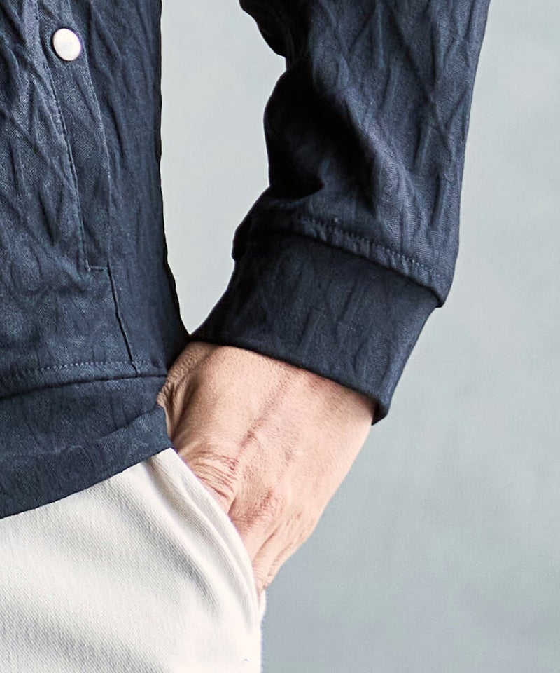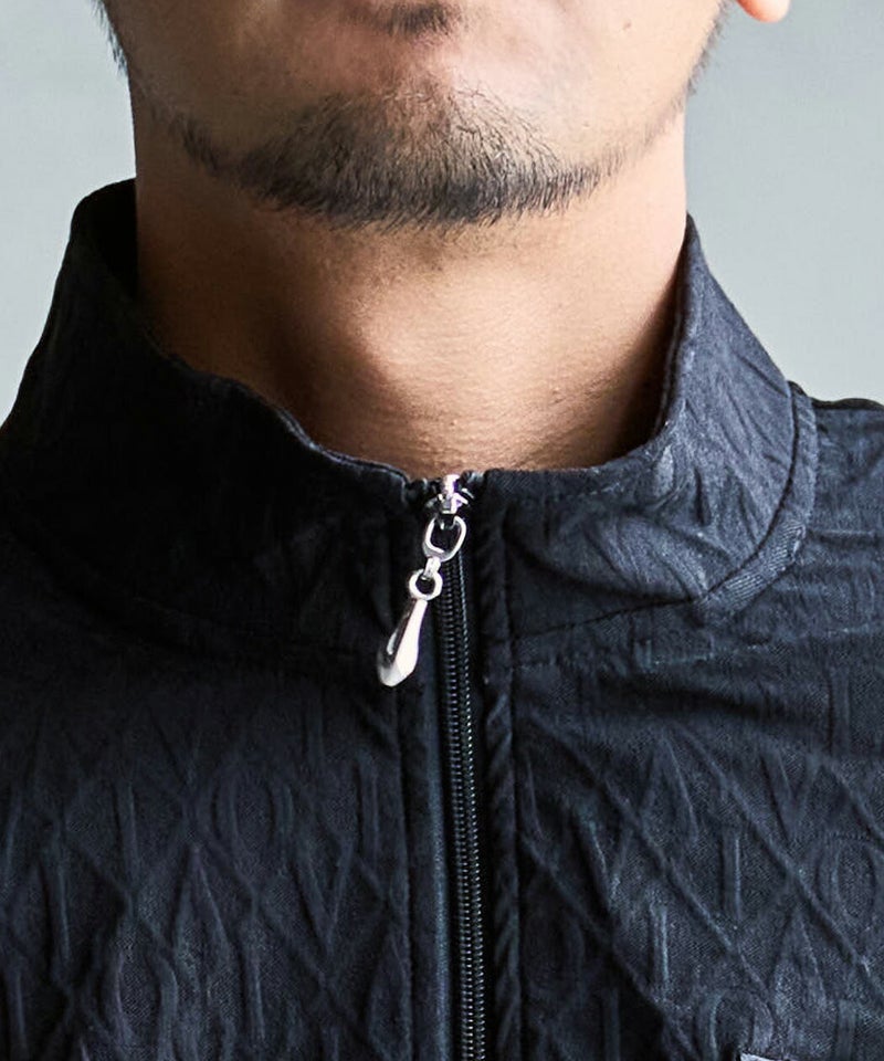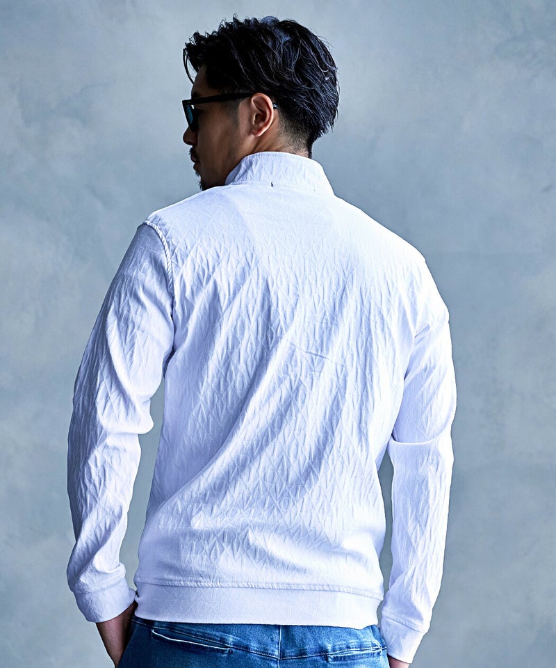 立体感のある幾何学調の総柄が、シンプルながらも圧倒的な存在感を放つ一着。