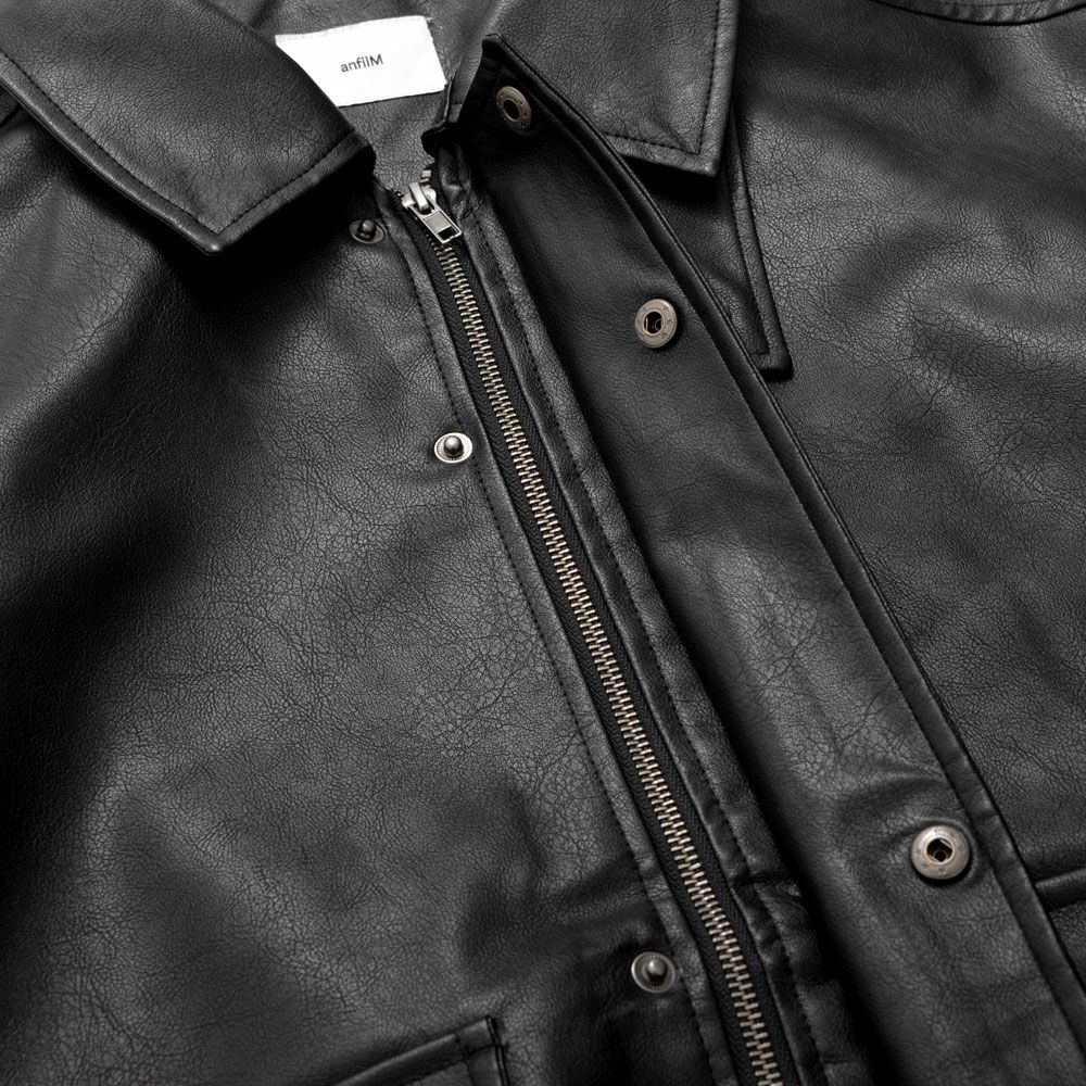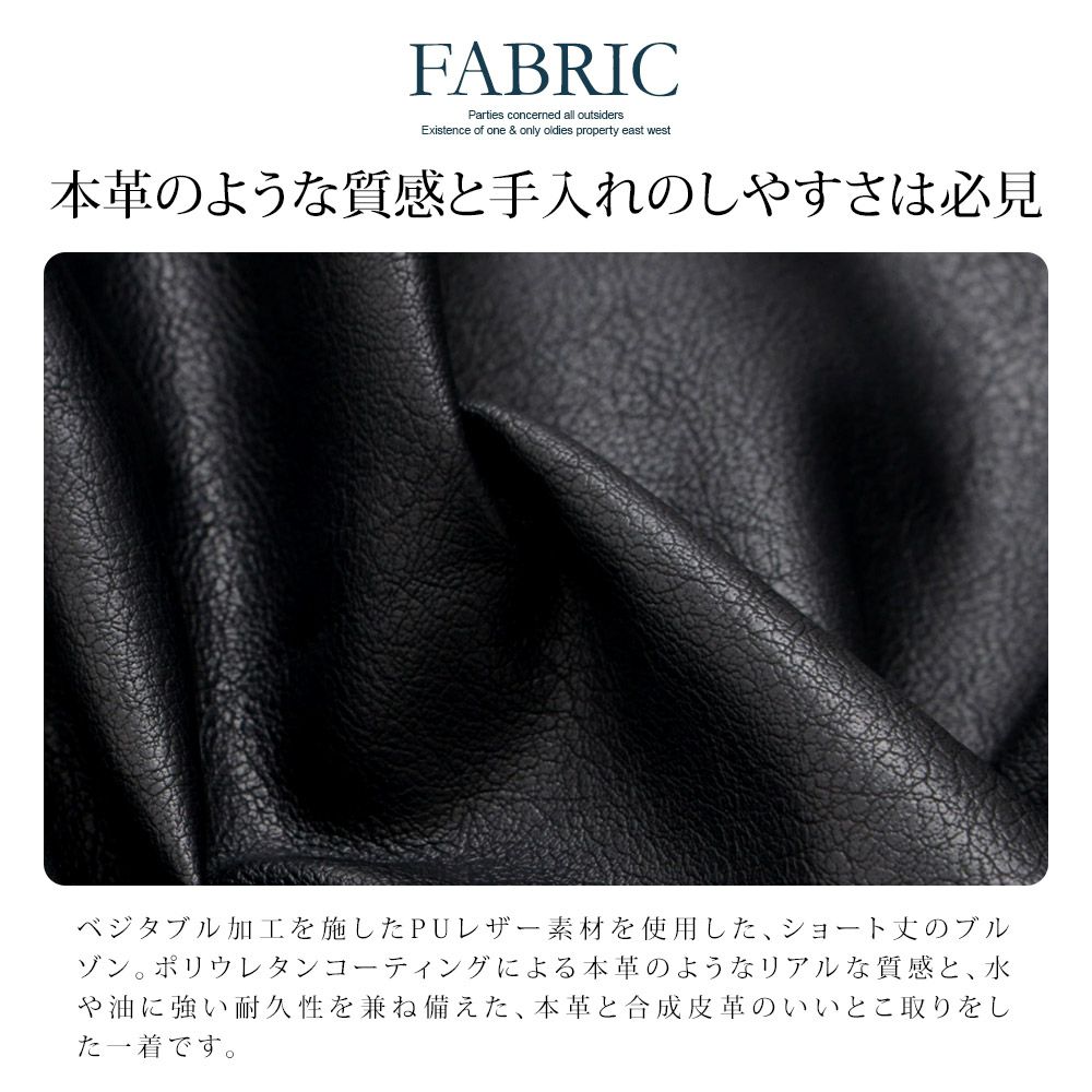 ポリウレタンコーティングによる本革のようなリアルな質感と、水や油に強い耐久性を兼ね備えた、本革と合成皮革のいいとこ取りをした一着です。