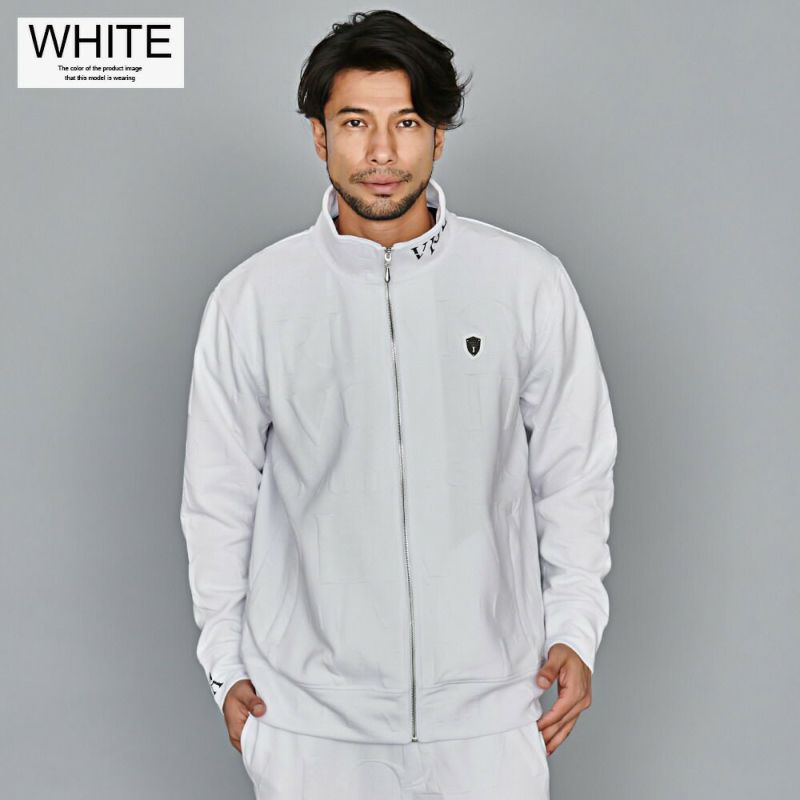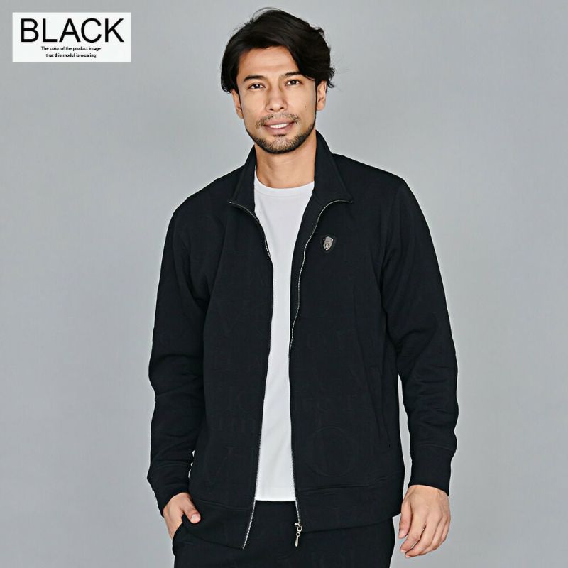 ジャガード生地でロゴを全体にほどこしコーデのアクセントにしたフルジップ長袖ジャケット。
