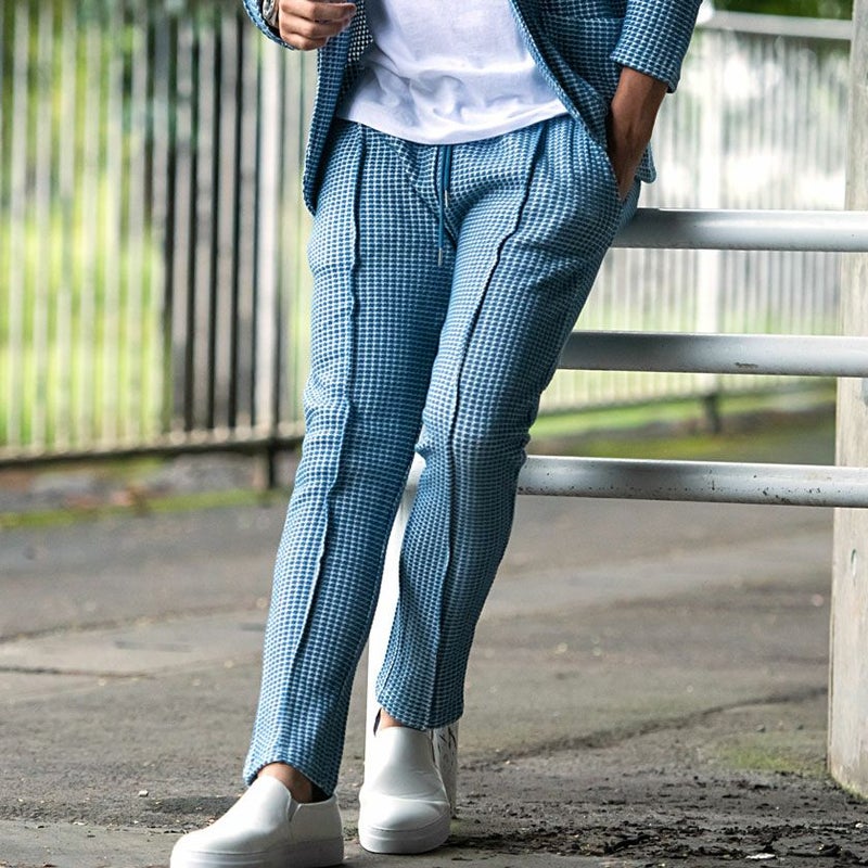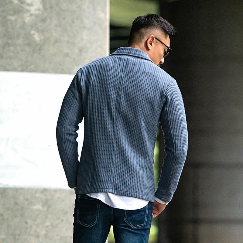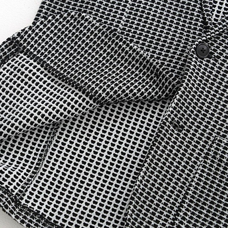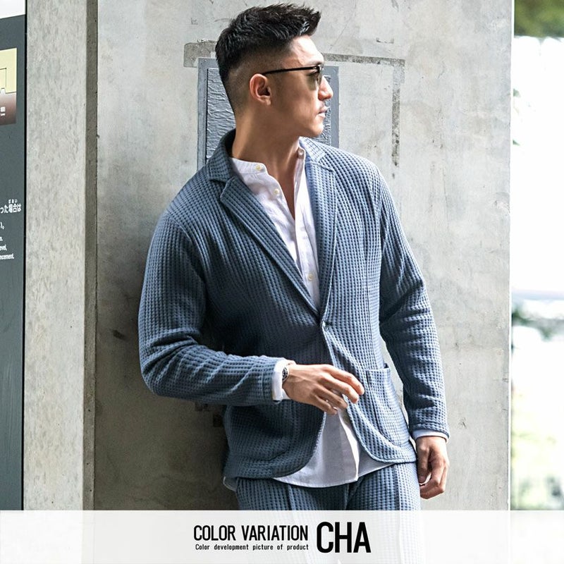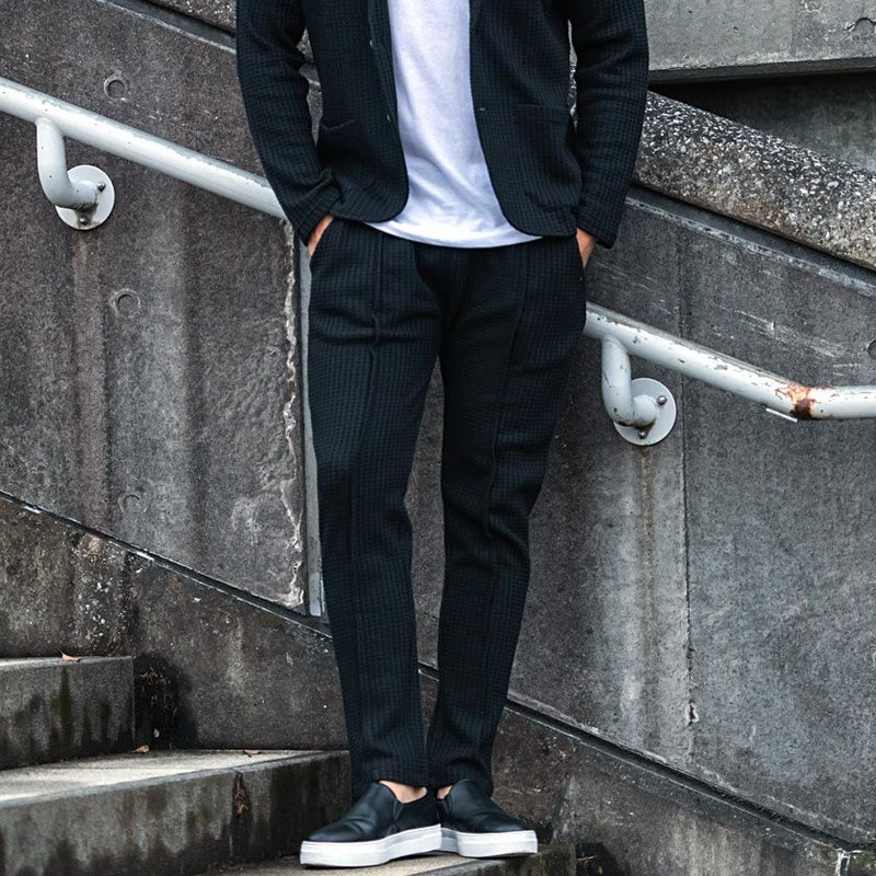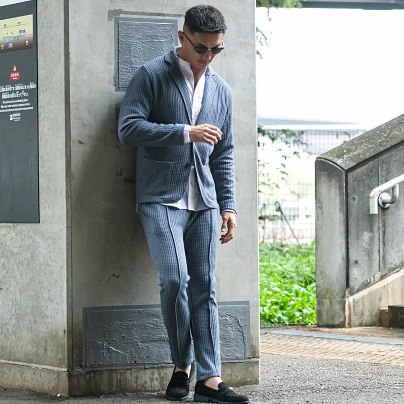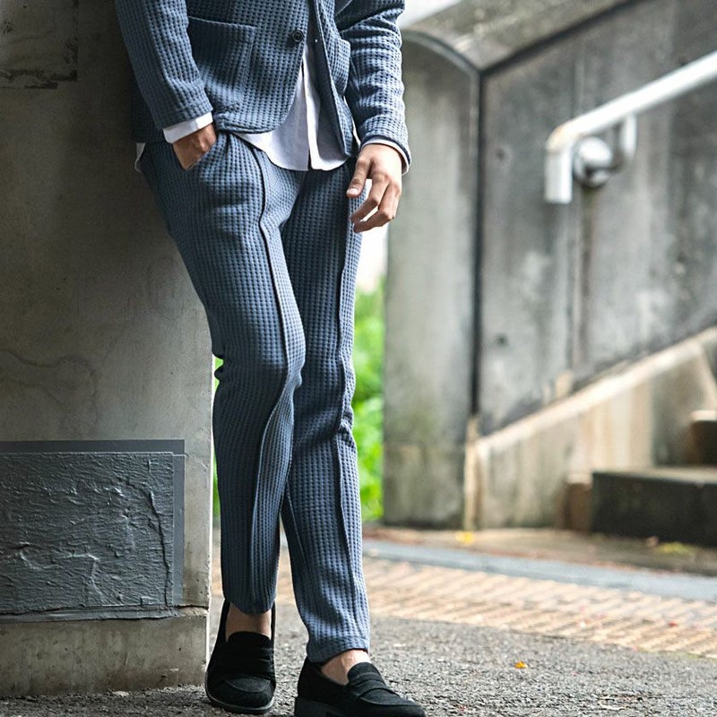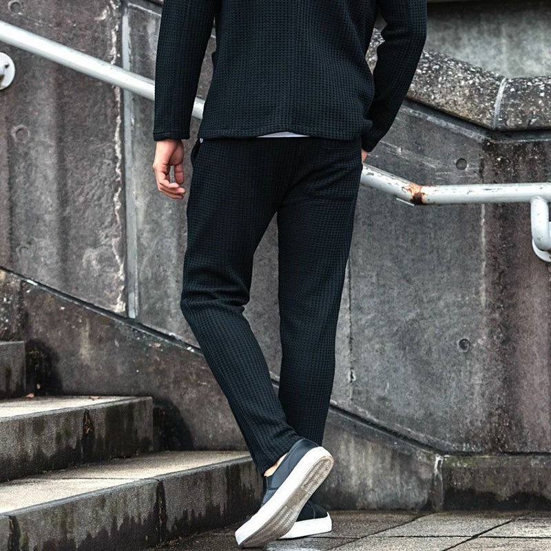 細身の縦ラインを基調としつつもストレッチ性の高いワッフル素材を使用し、街着からリモートワークまでON / OFFとわず使うことが出来ます。