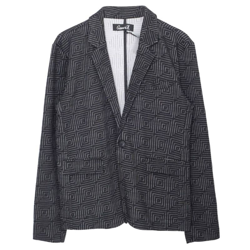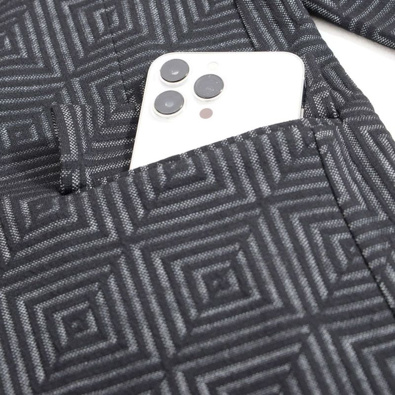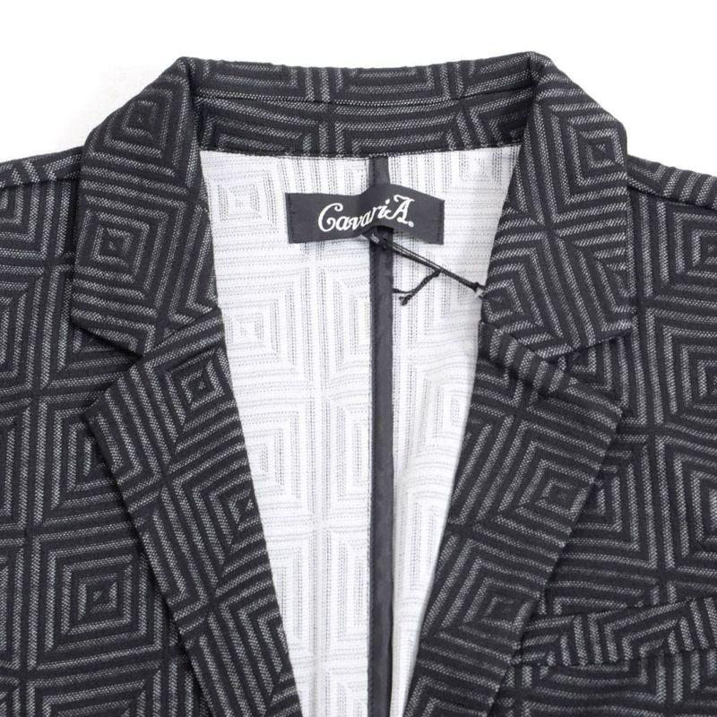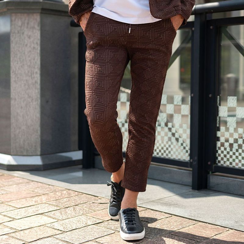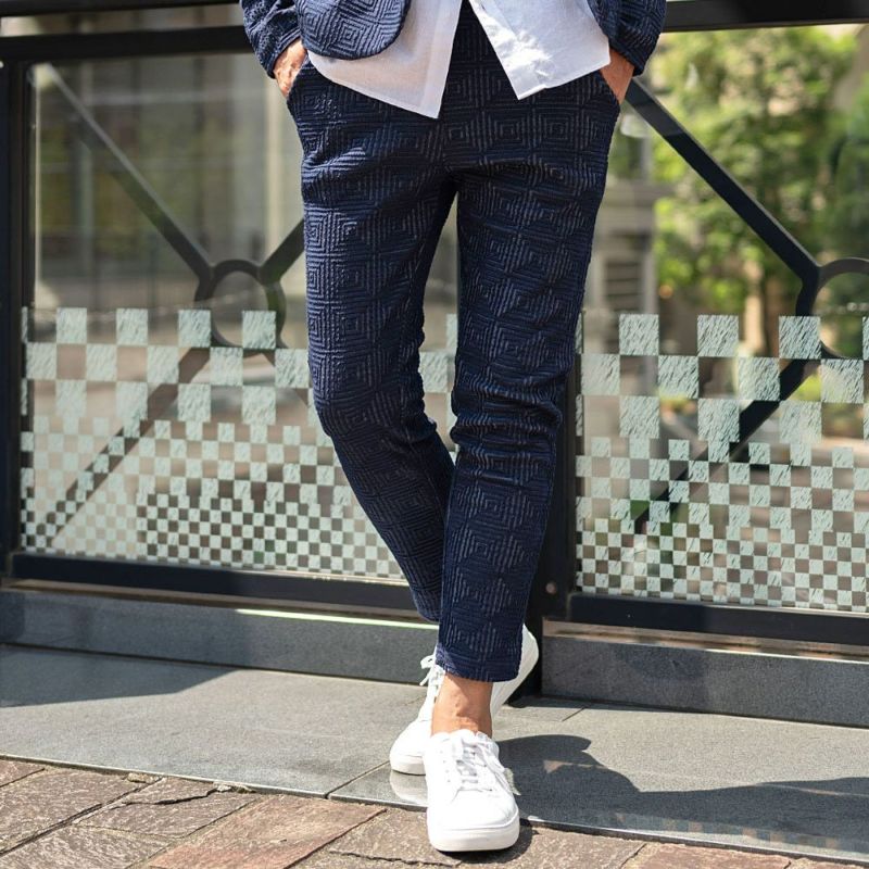 表面に凹凸のある織り柄が特徴のジャガード生地を使用し、スクエアパターンで構成された立体感のあるテーラードジャケットとアンクルパンツのセットアップ。
