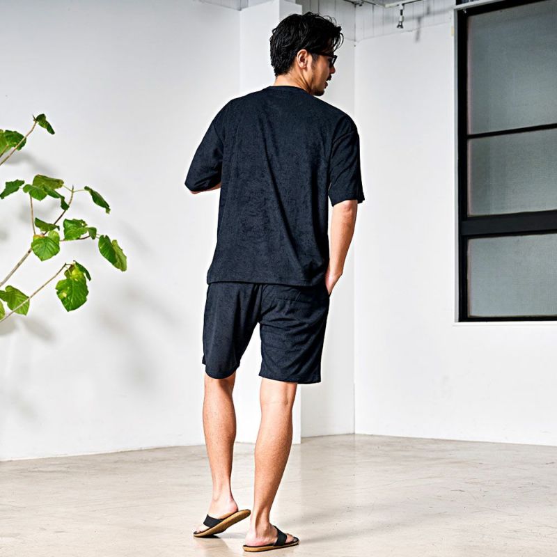 やわらかな肌触りと吸水性を兼ね備えたパイル素材を使用し、ルームウェア、ワンマイルウェア、パジャマとしても使える万能な上下セットアップです。
