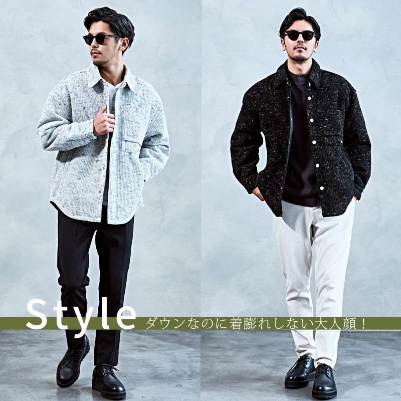 表情豊かなモールツイード素材を使用し、ダウンジャケットでありながらカジュアルになりすぎない、上品で落ち着いた印象に仕上げた一着です。