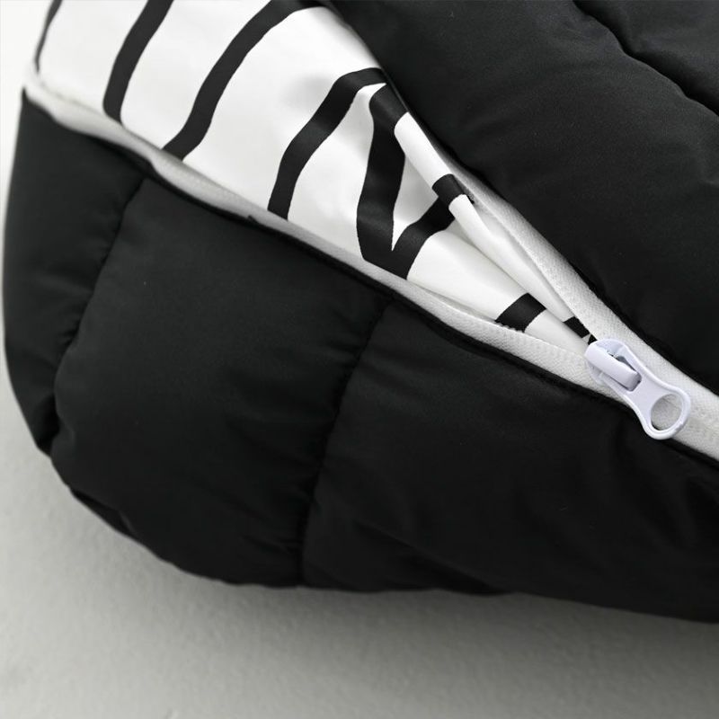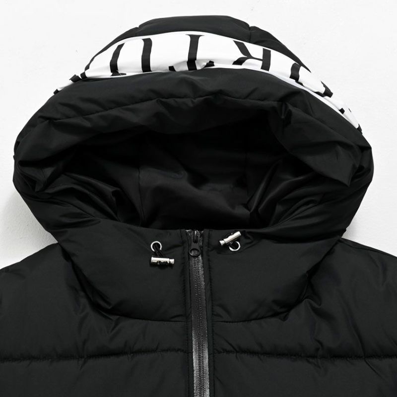 ボリュームのあるフード部分にはジップを施し、ジップを開けるとロゴプリントが個性的なデザインに仕上がりました。
