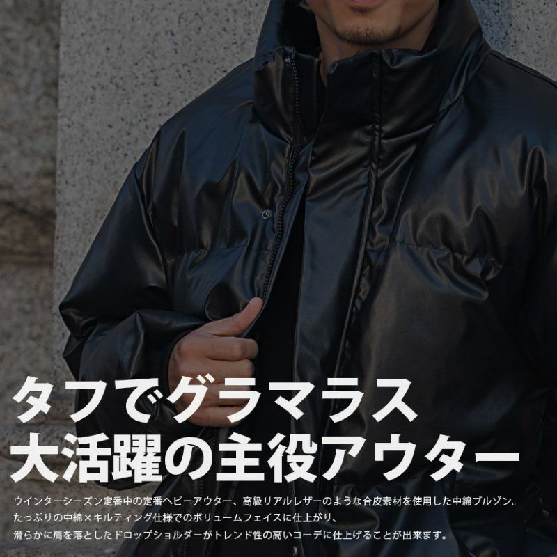 ウインターシーズン定番中の定番ヘビーアウター、高級リアルレザーのような合皮素材を使用した中綿ブルゾン。