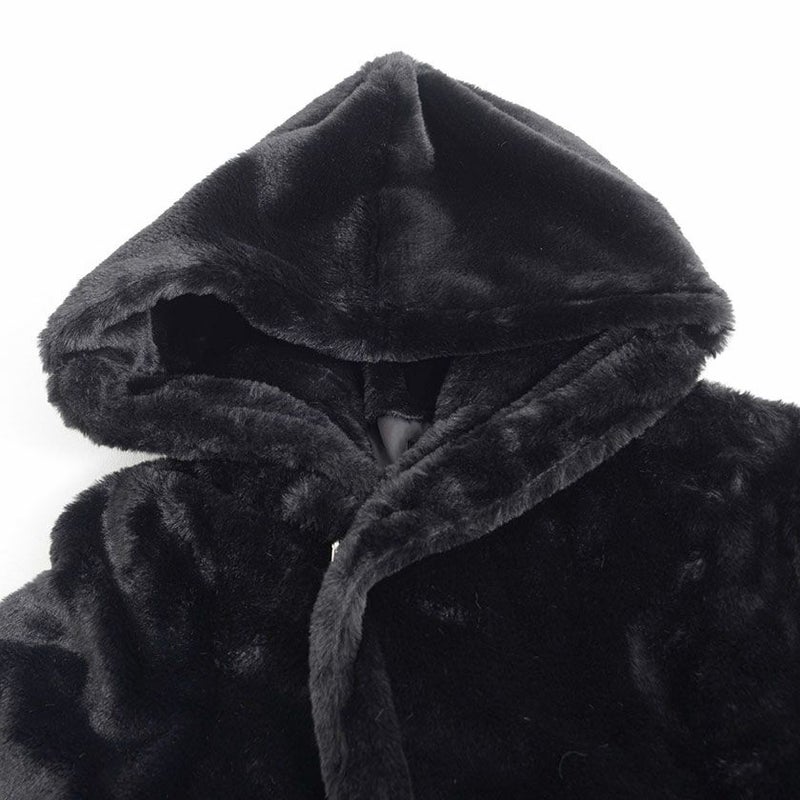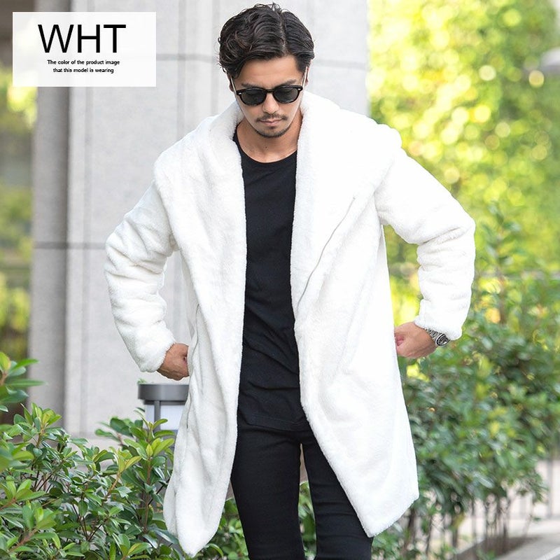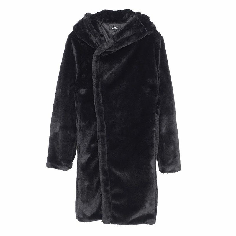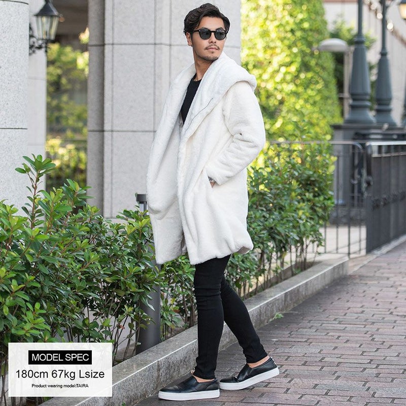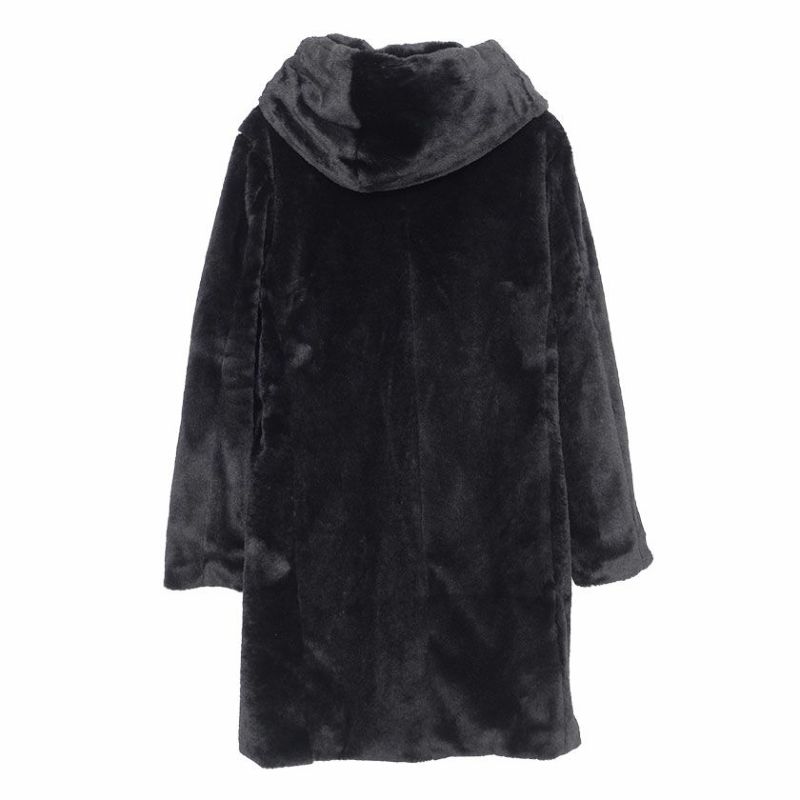 ふわふわモコモコのファー素材を使ったフード付き変形ロングコートです。