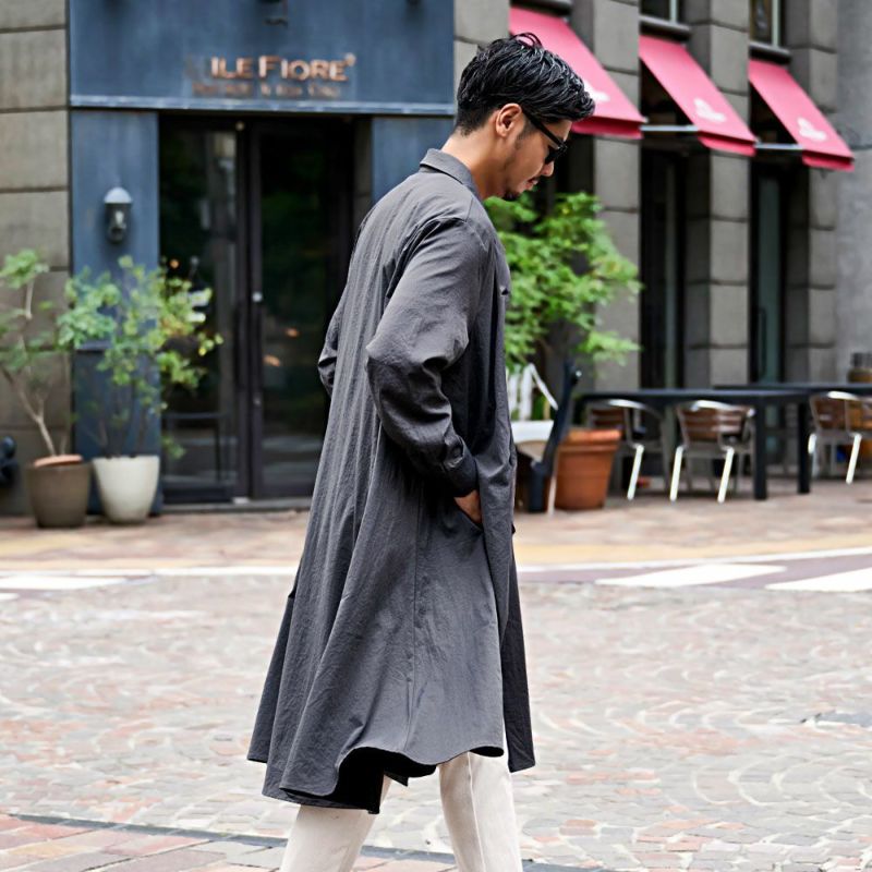薄手のシャツ地が動くたびに揺れ、自然なドレープ感を生み出し、大人の余裕を感じさせる仕上がりです。