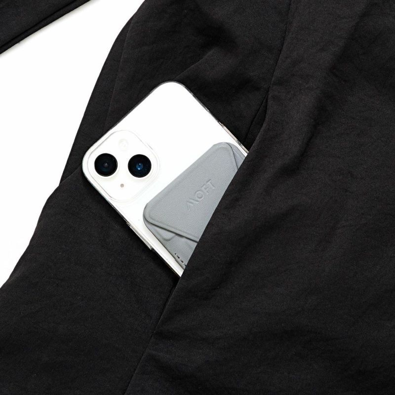 大きめのサイドポケットを備え、ライトアウターとしての機能性も兼備しています。