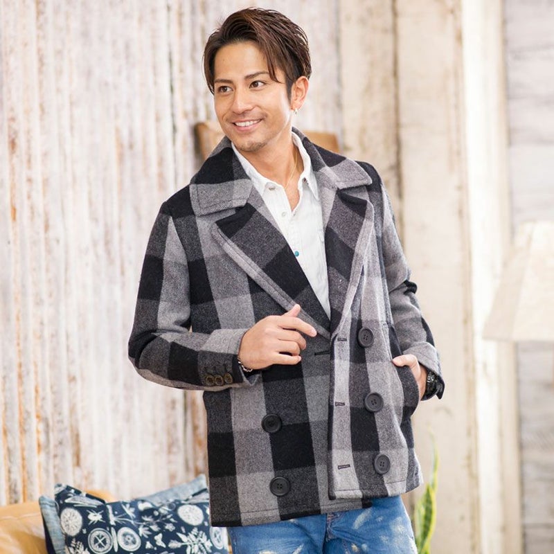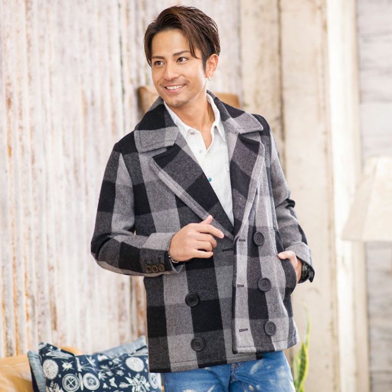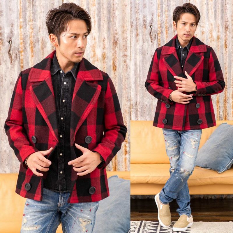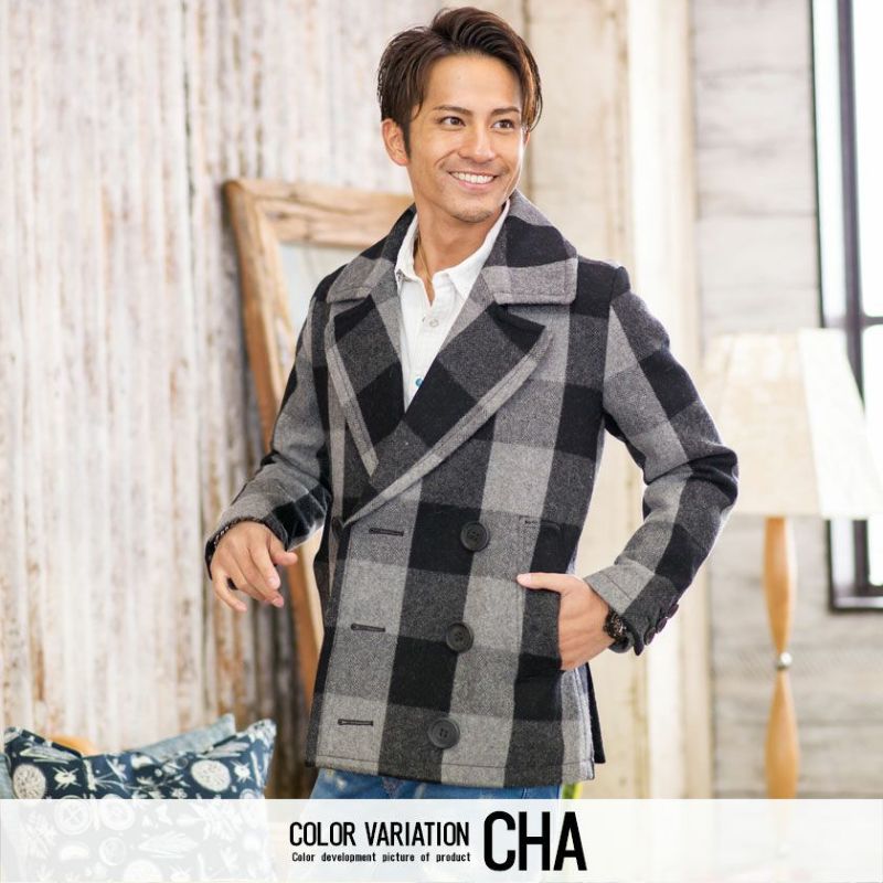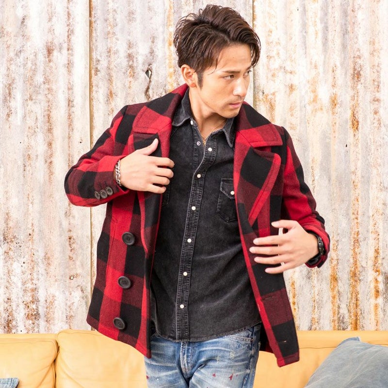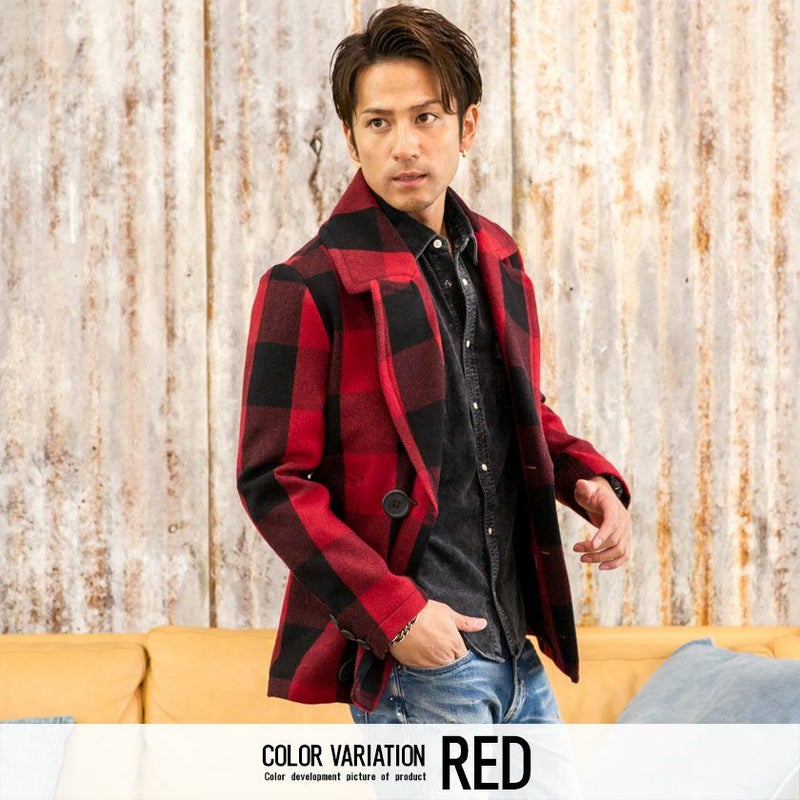 アルパカ混のビッグバッファローチェックメルトンを使用した、ピーコート。