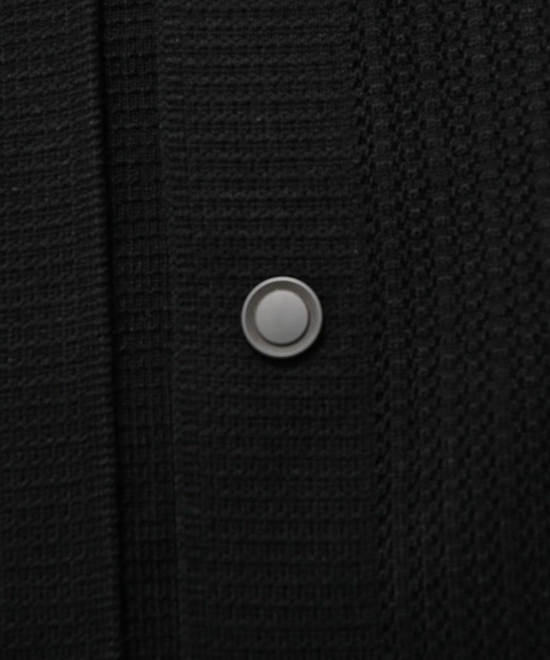 フロントの飾りボタンとポケットデザインが、さりげないアクセントとしてコーディネートを引き締めます。