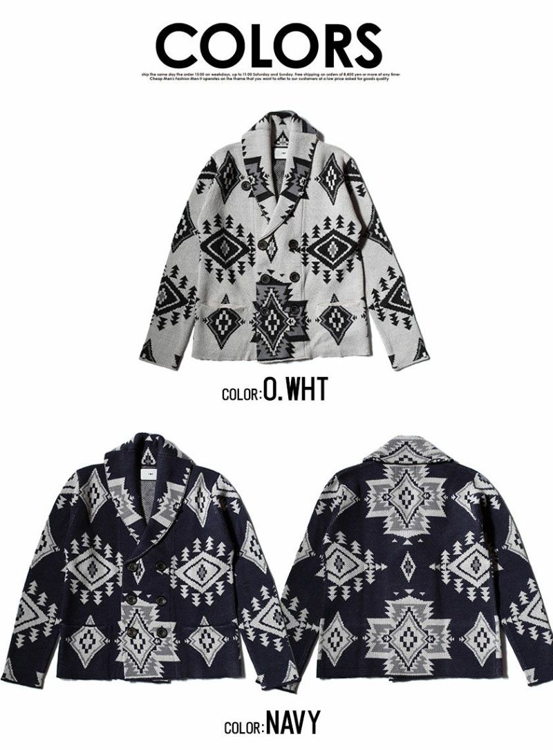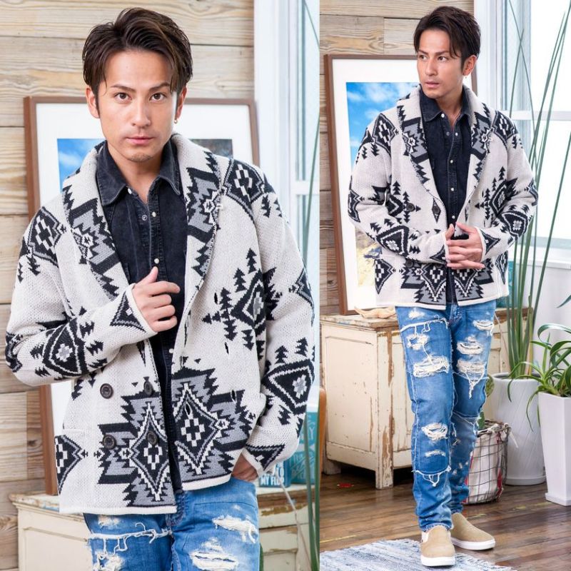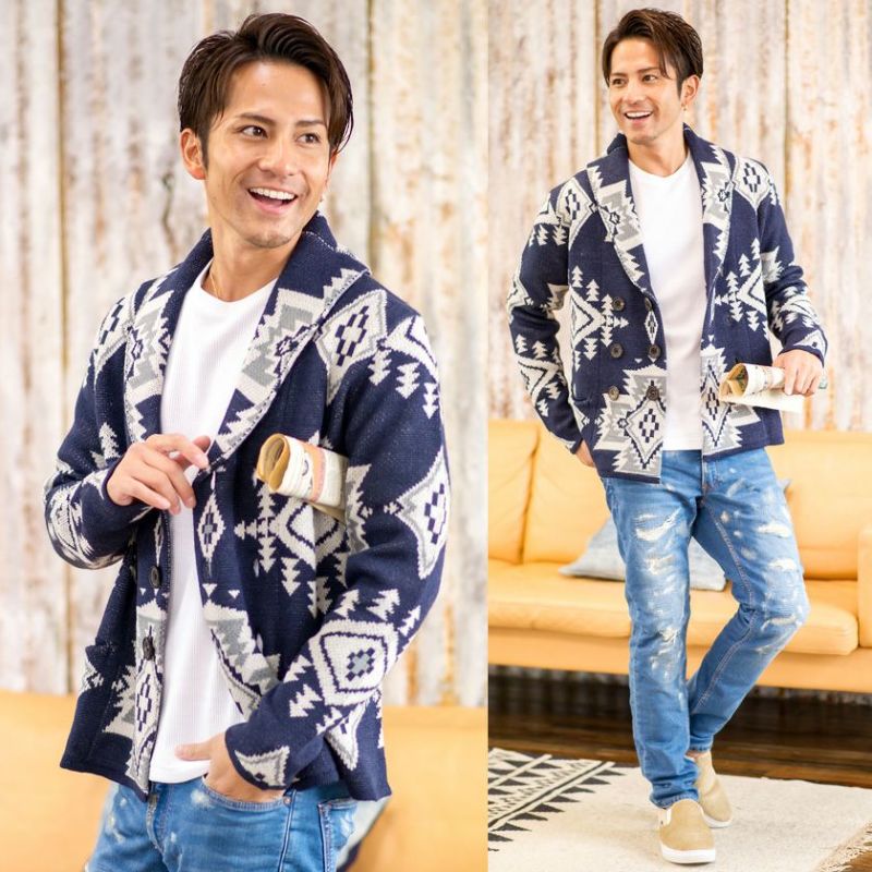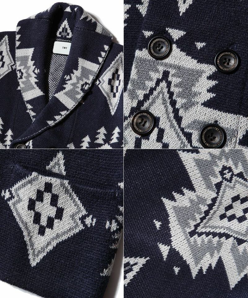 ビターなカジュアルスタイルにぴったりなカーディガン。季節の変わり目に大活躍! 【SALE/セール】【送料無料】TMT(ティーエムティー)NATIVE JACQUARD KNIT W-BREASTE CARDIGAN/全2色