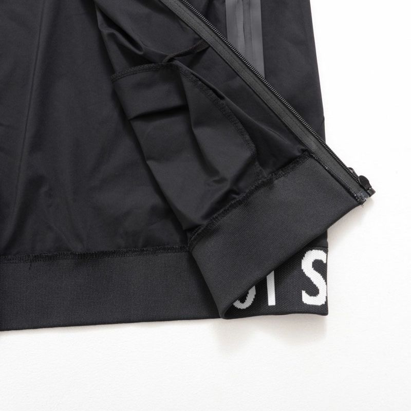 両サイドにあるポケットのジップ部分に特殊なフィルムをラミネート、防水仕様にした止水ファスナーを採用。