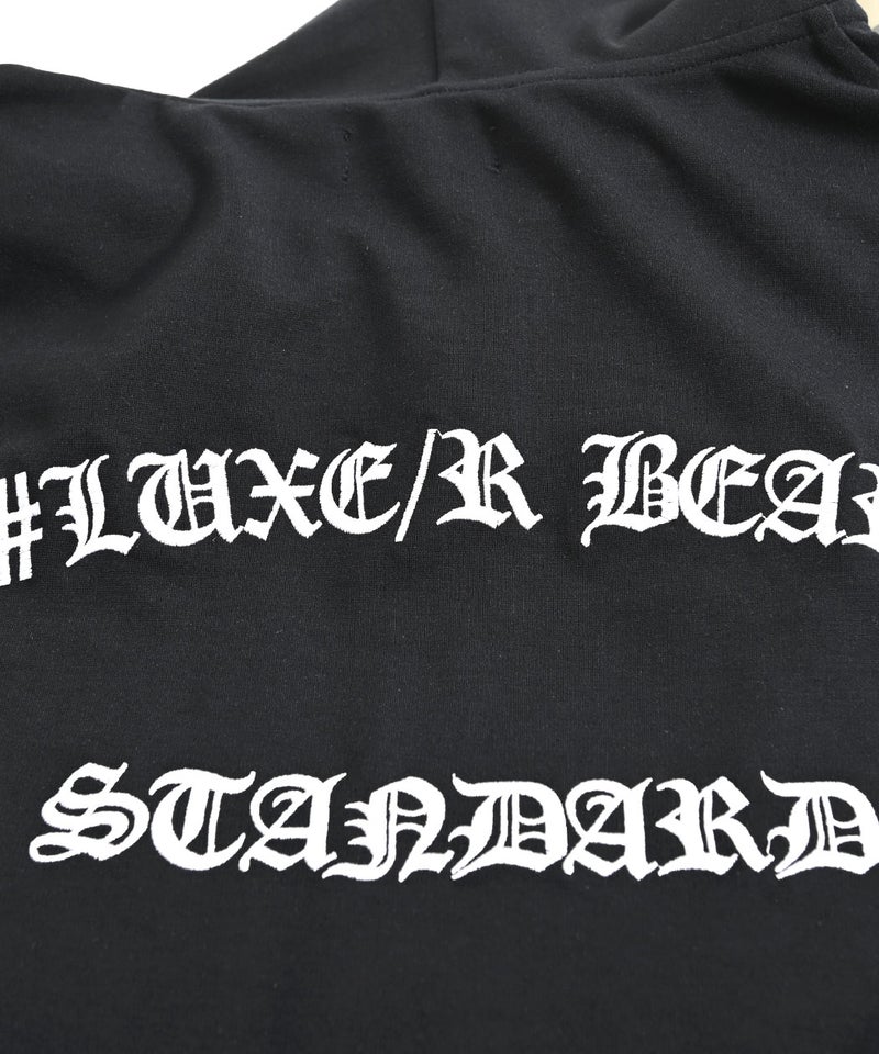 胸元にはブランドオリジナルの総柄ベア、バックには大胆にメッセージロゴを配置。