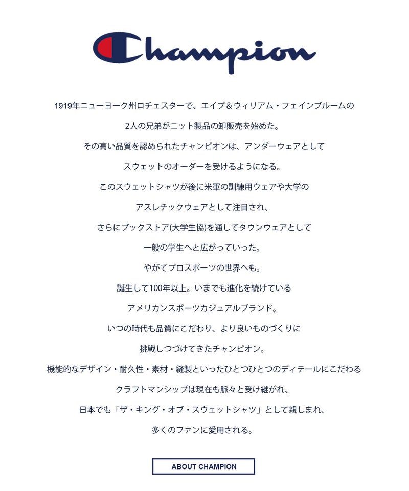 機能的なデザイン・耐久性・素材・縫製といったひとつひとつのディテールにこだわる クラフトマンシップは現在も脈々と受け継がれ、日本でも「ザ・キング・オブ・スウェットシャツ」として親しまれ、多くのファンに愛用される。