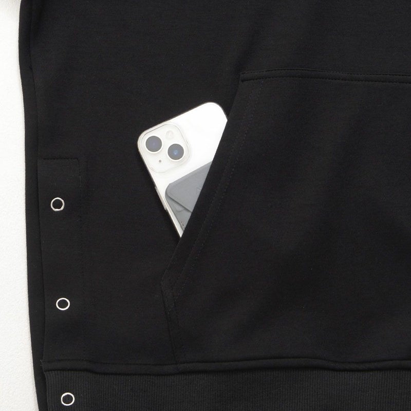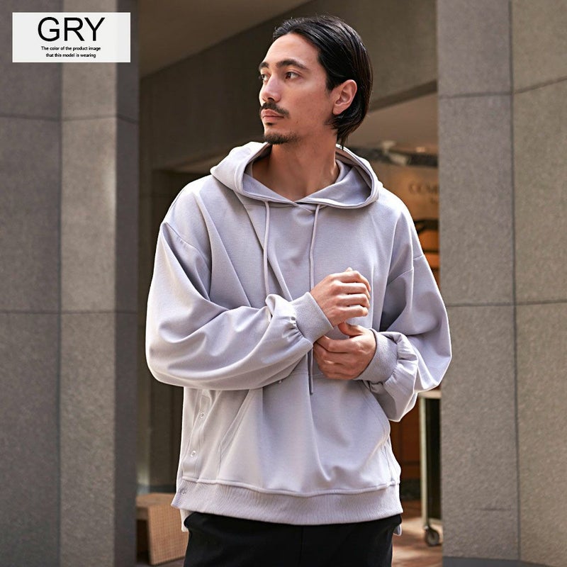 スナップボタン付きのサイドスリットは開閉可能で、シルエットに変化をもたせられるギミックが特徴。