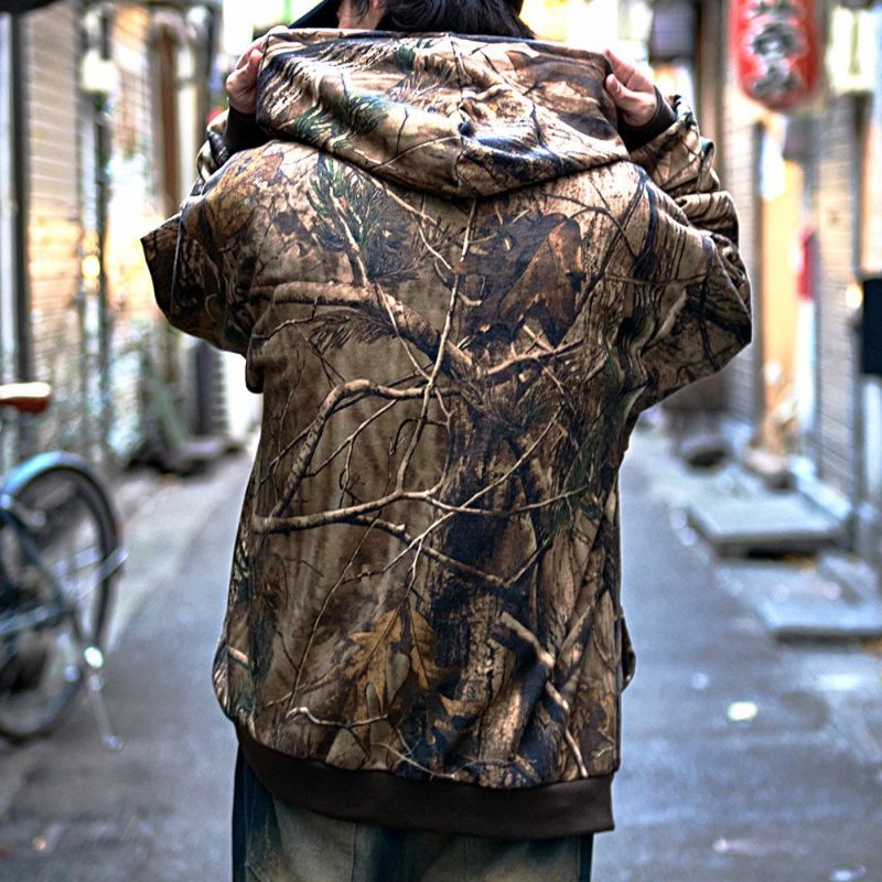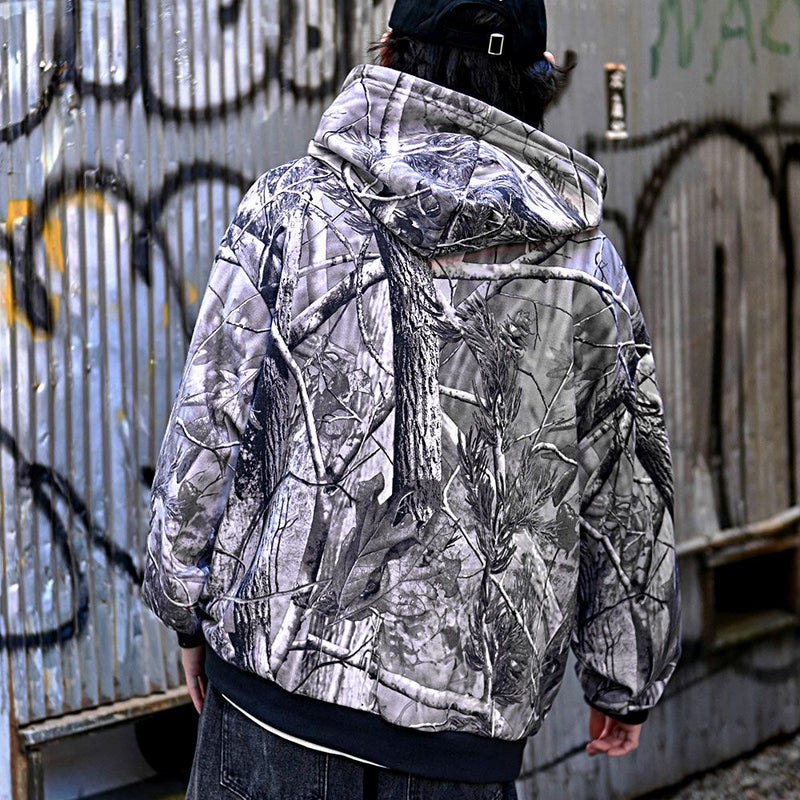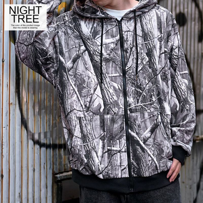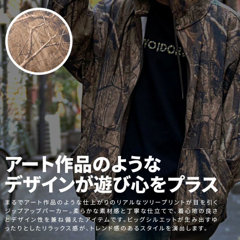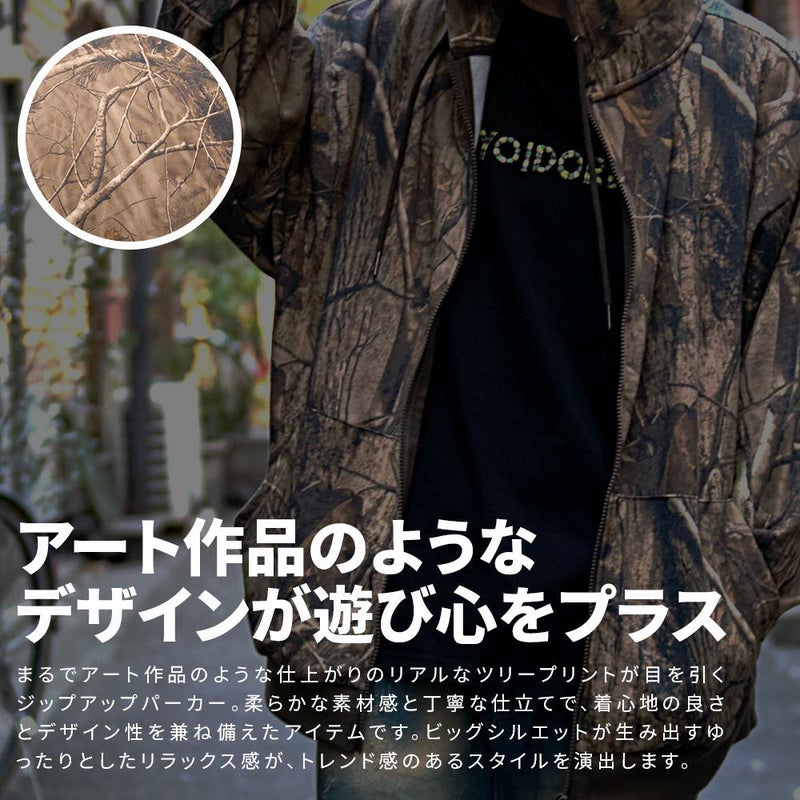 まるでアート作品のような仕上がりのリアルなツリープリントが目を引くジップアップパーカー。