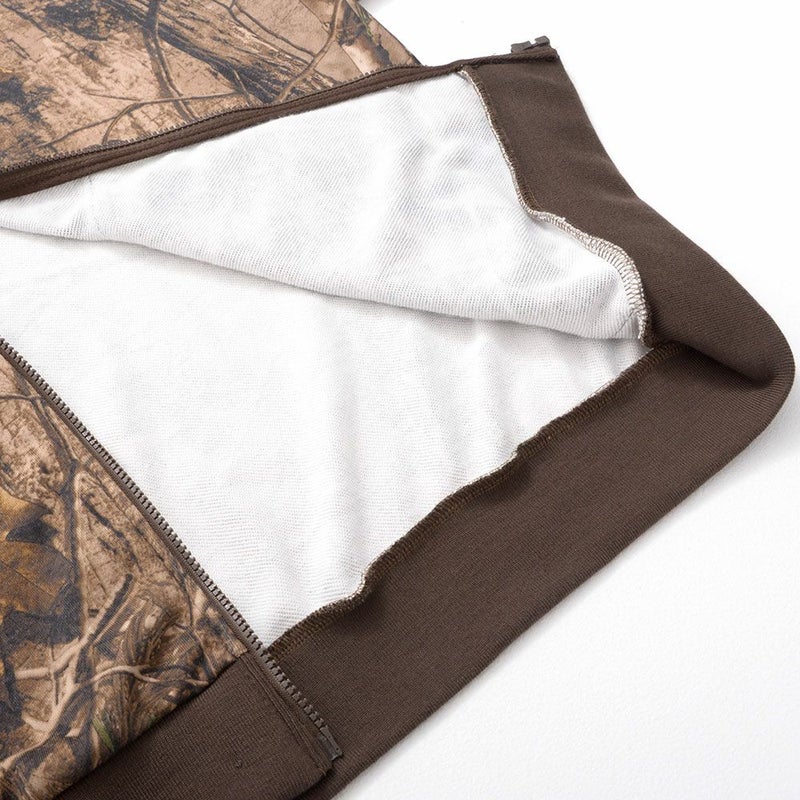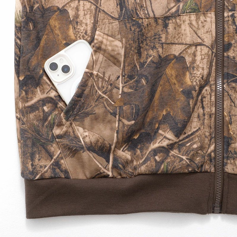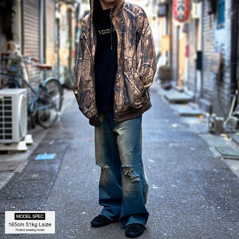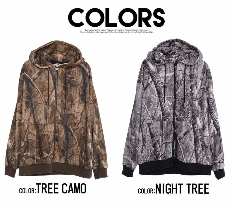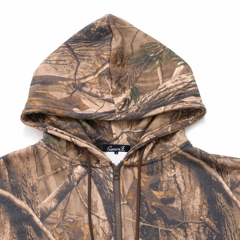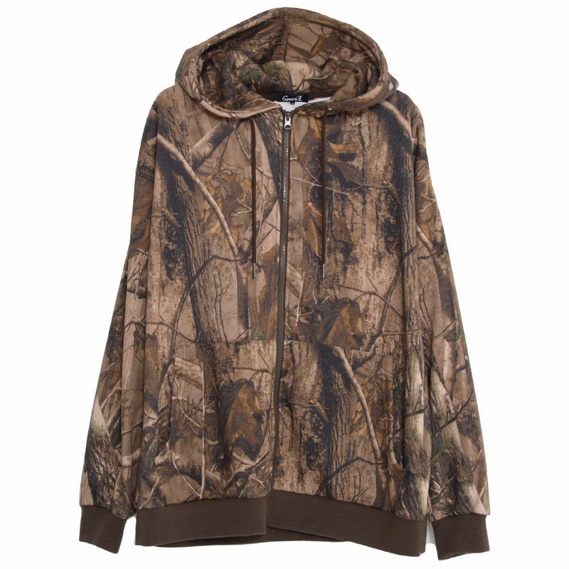 まるでアート作品のような仕上がりのリアルなツリープリントが目を引くジップアップパーカー。