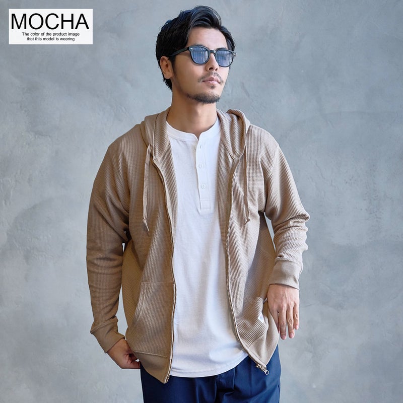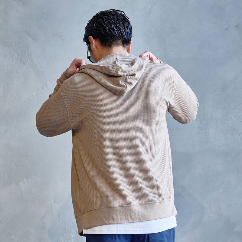 ふんわり柔らかなワッフル素材を採用したジップアップパーカー。