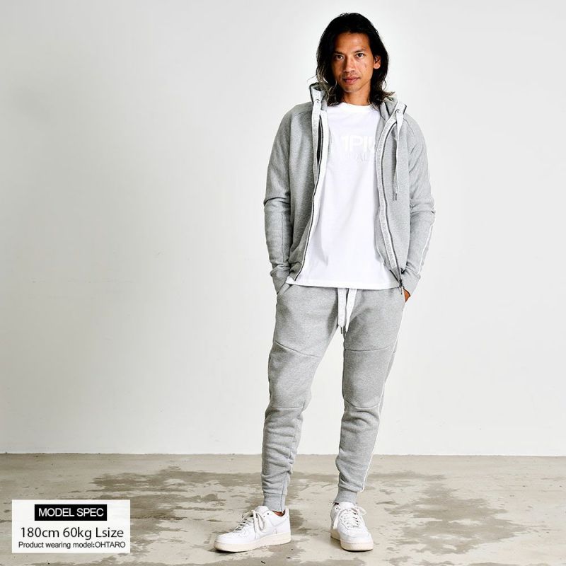 同デザインのジョガーパンツと合わせれば大人のラグスポスタイルの完成です。