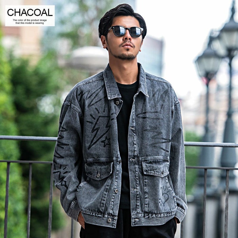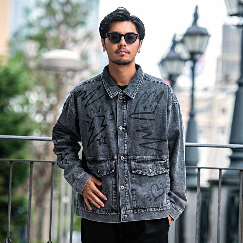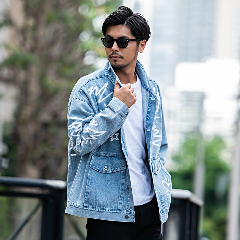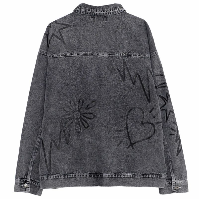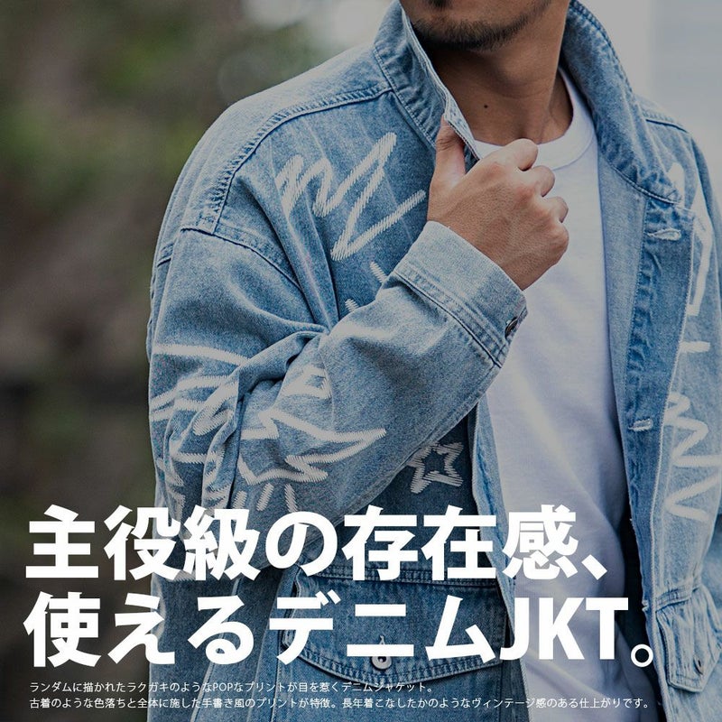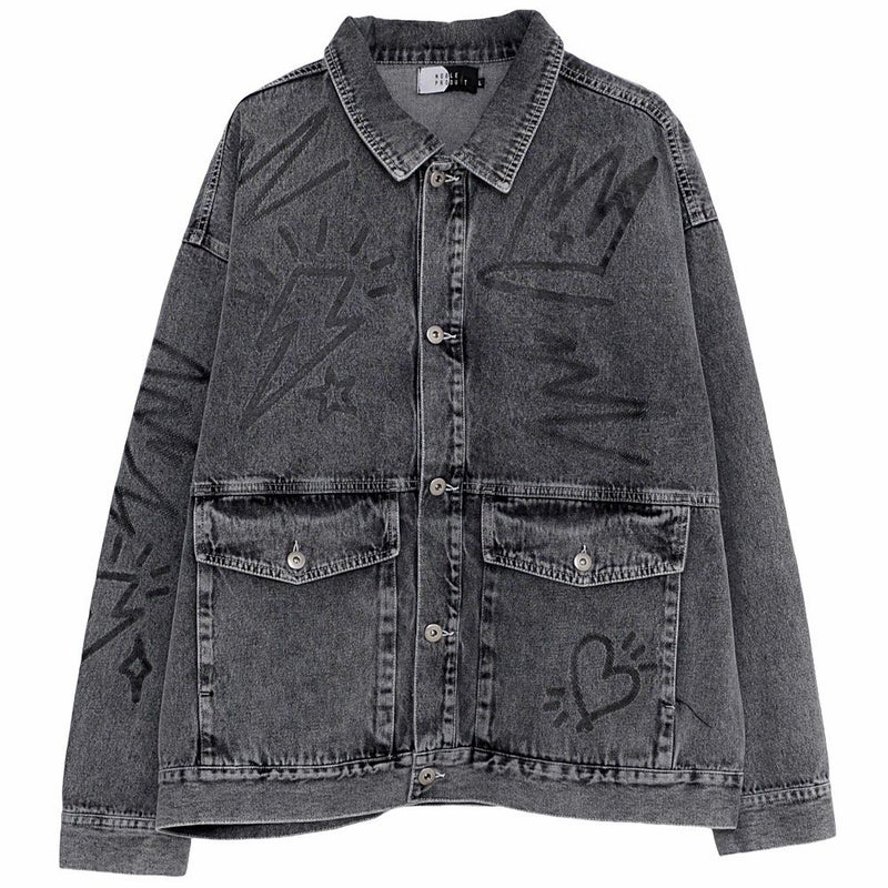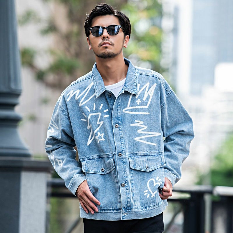 ランダムに描かれたラクガキのようなPOPなプリントが目を惹くデニムジャケット。
