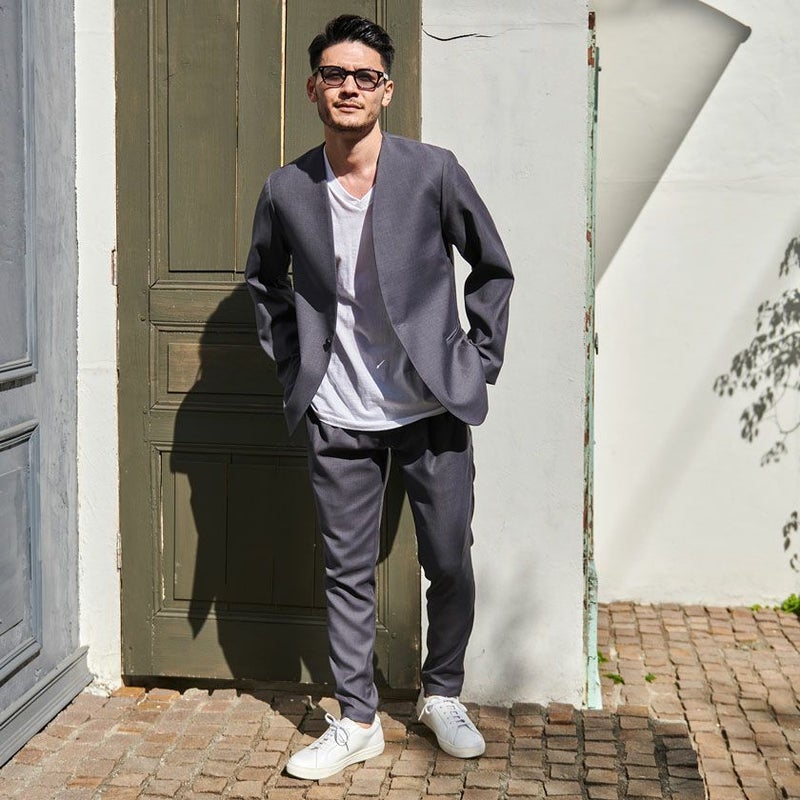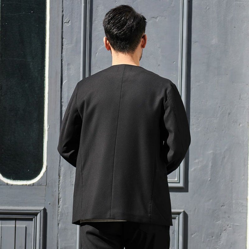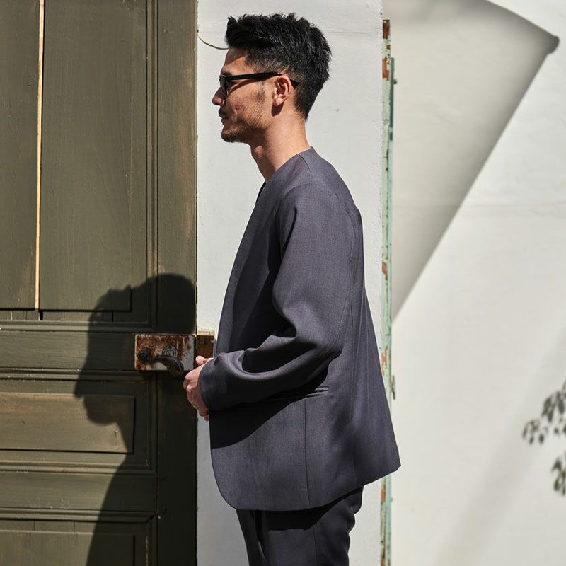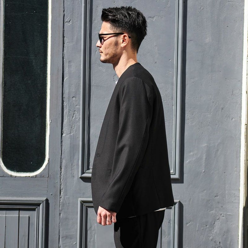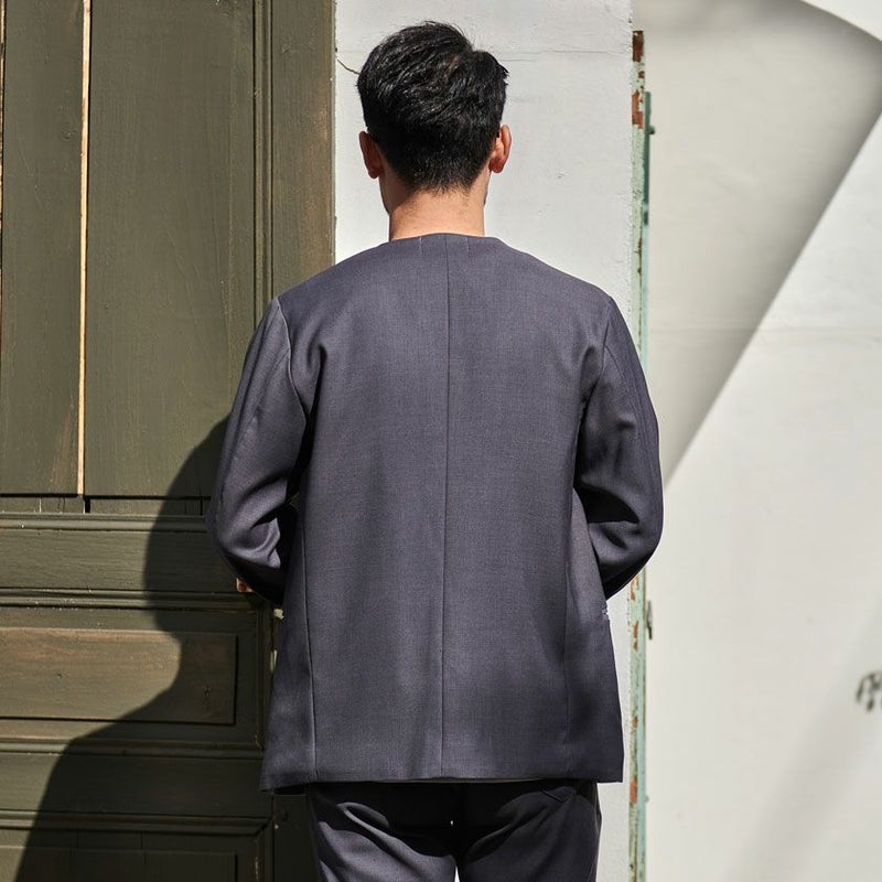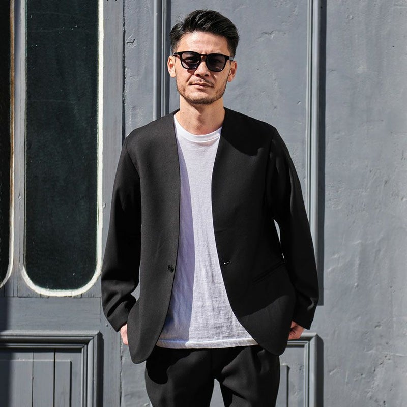 シンプルでベーシックなデザインのノーカラージャケット