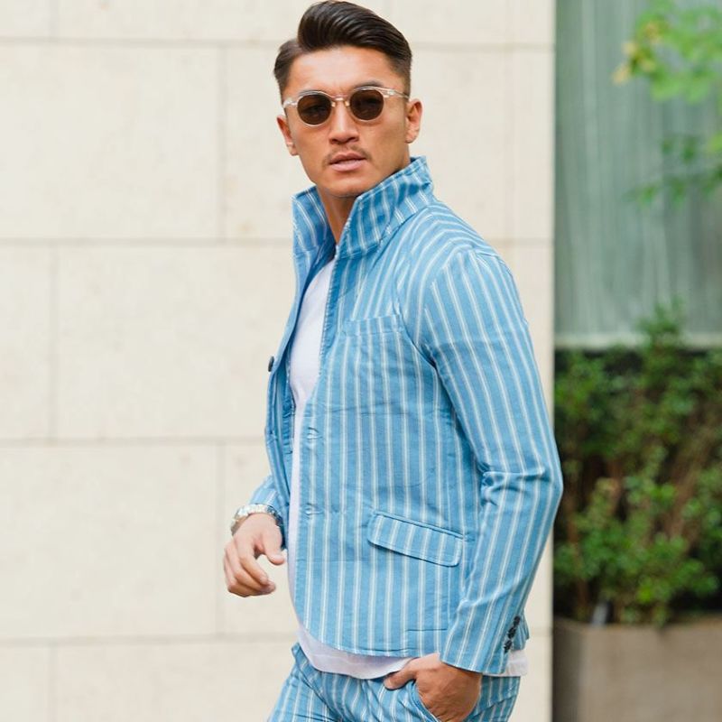 デニムのような色落ち加工を施したストライプ柄のイタリアンカラージャケット。