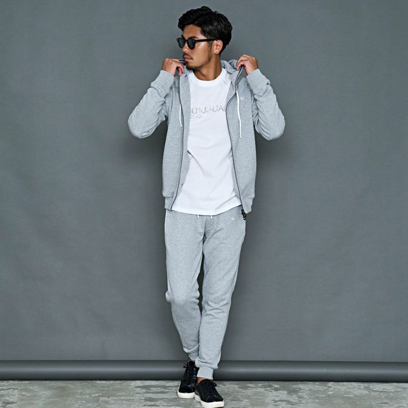 同生地のパーカーと合わせたセットアップスタイルも是非。