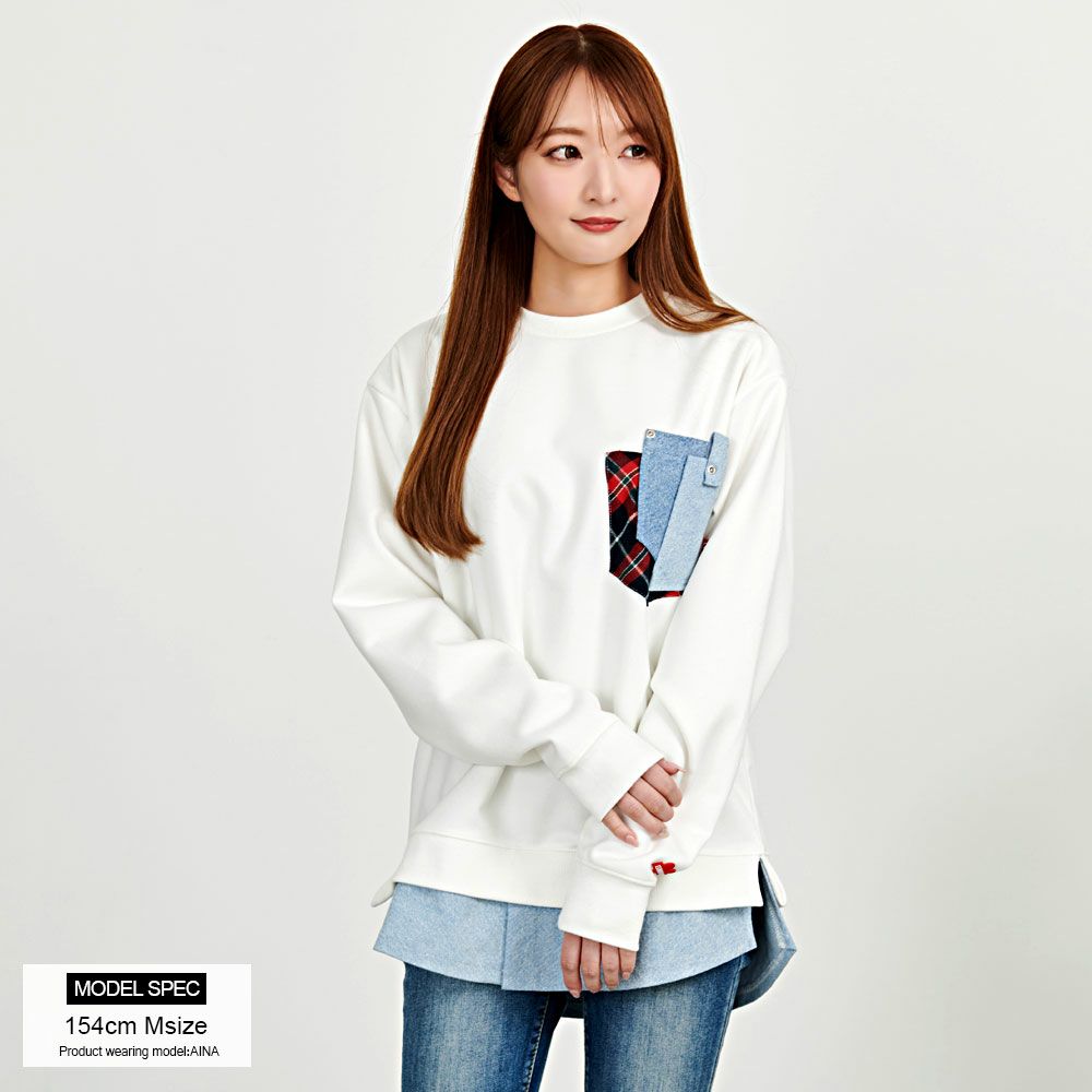 他の画像を見る デニムとチェック柄の生地がポケットに施されたクルーネックトレーナー。裾はシャツを重ね着しているようなフェイクレイヤード仕様。 LUXE/R(ラグジュ)クルーネック デニムポケット長袖トレーナー/全2色 販売価格 ¥ 8,690 税込 カートに入れる お気に入りに登録する