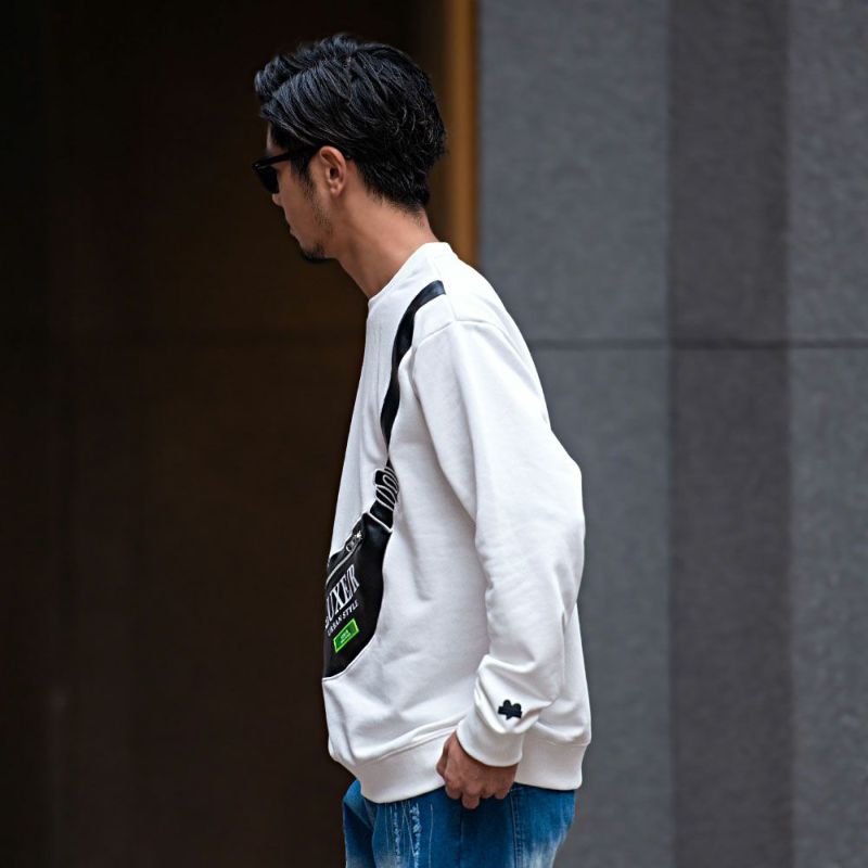フロントに大きく施されたリアルウェストポーチがインパクト抜群のトレーナー。
