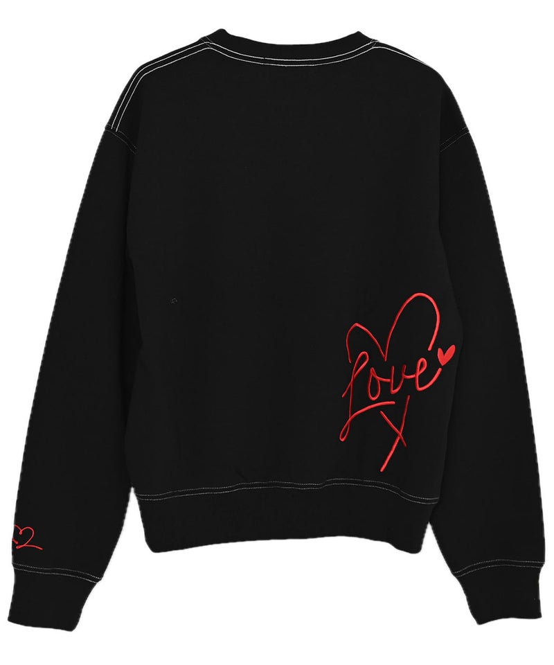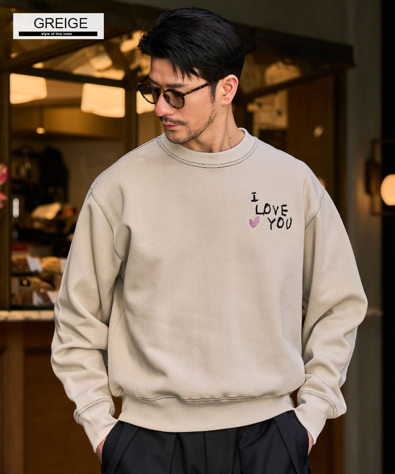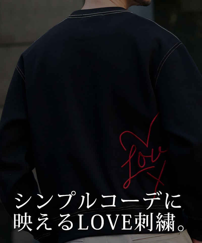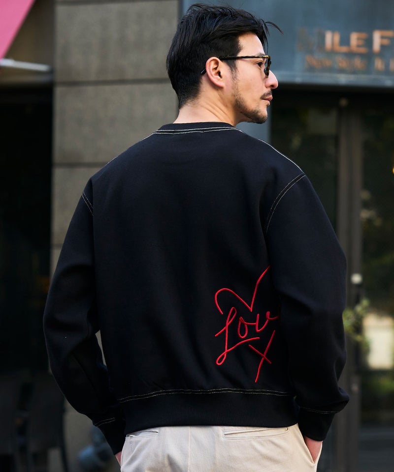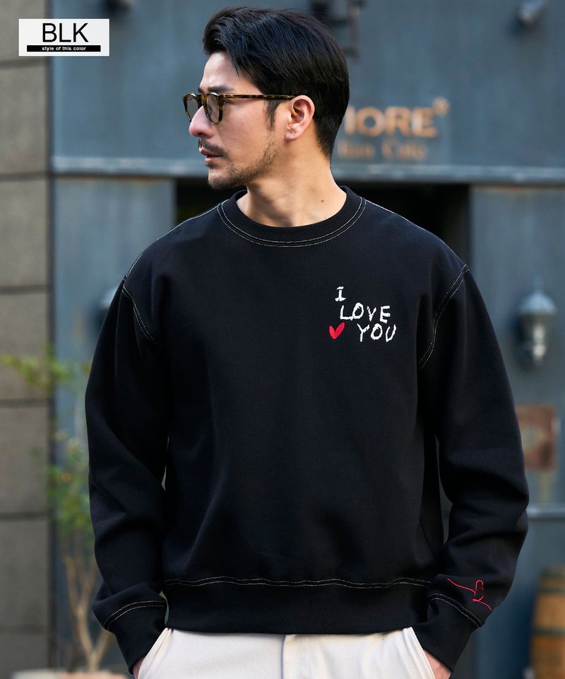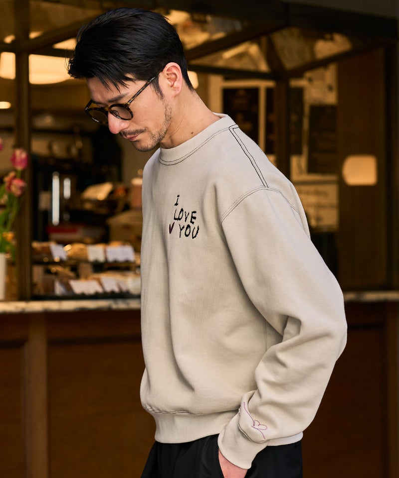 フロントに施された「I LOVE YOU」のロゴ刺繍と、バックにあしらったハートマークと「LOVE」の刺繍デザインが目を引く、遊び心と存在感を兼ね備えたデザイントレーナー。