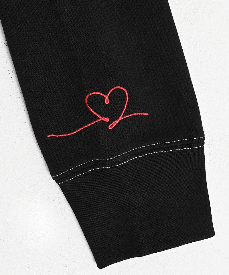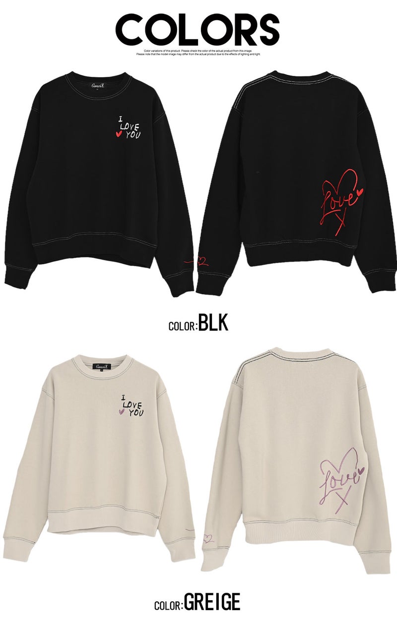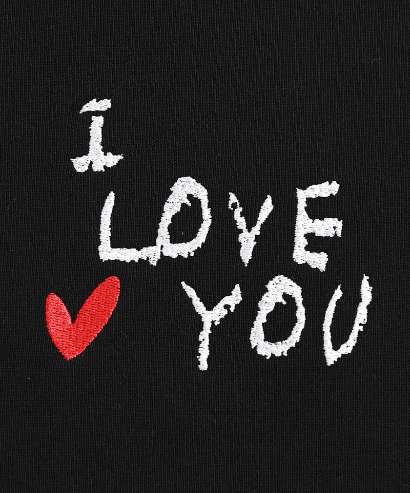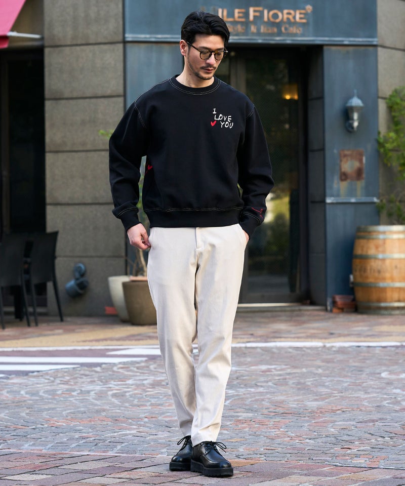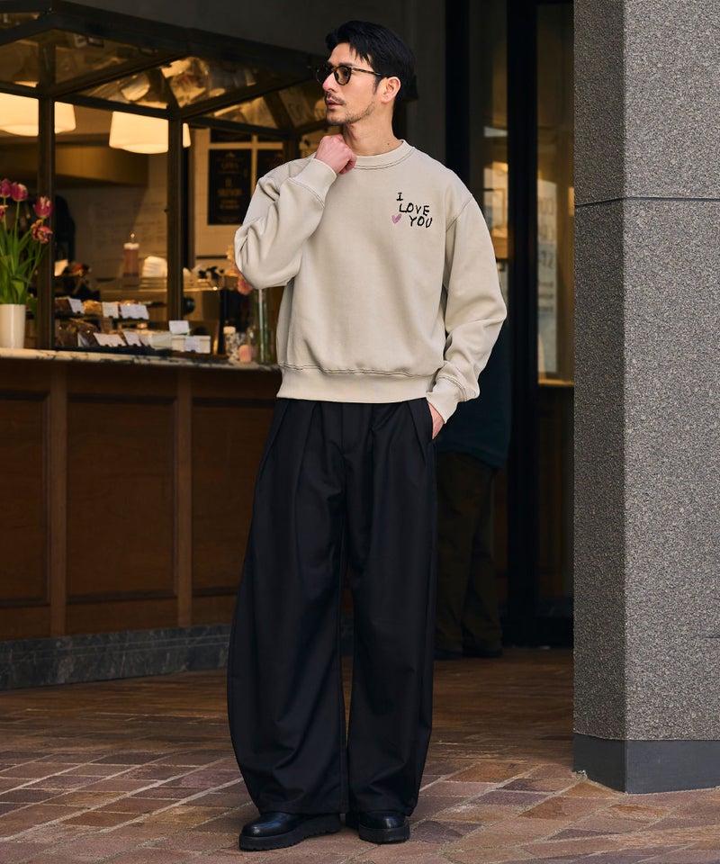 フロントに施された「I LOVE YOU」のロゴ刺繍と、バックにあしらったハートマークと「LOVE」の刺繍デザインが目を引く、遊び心と存在感を兼ね備えたデザイントレーナー。