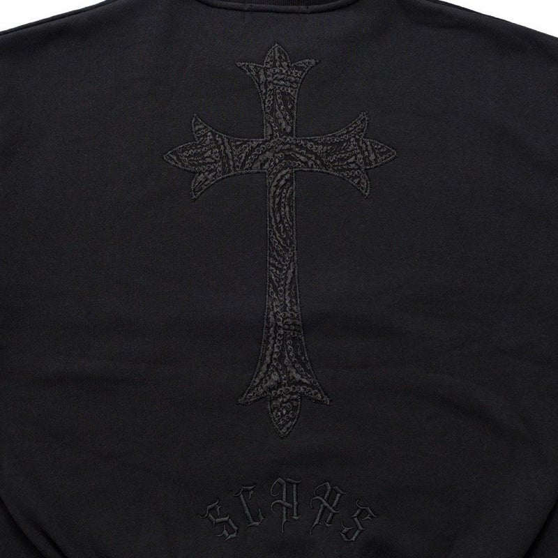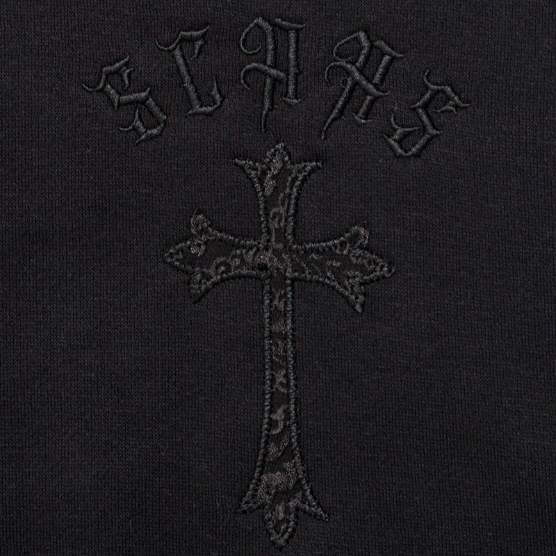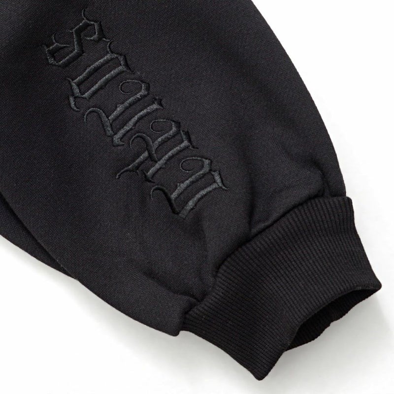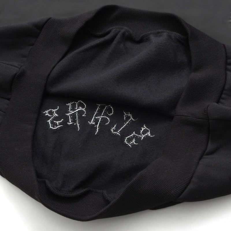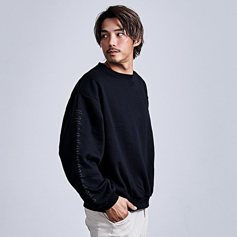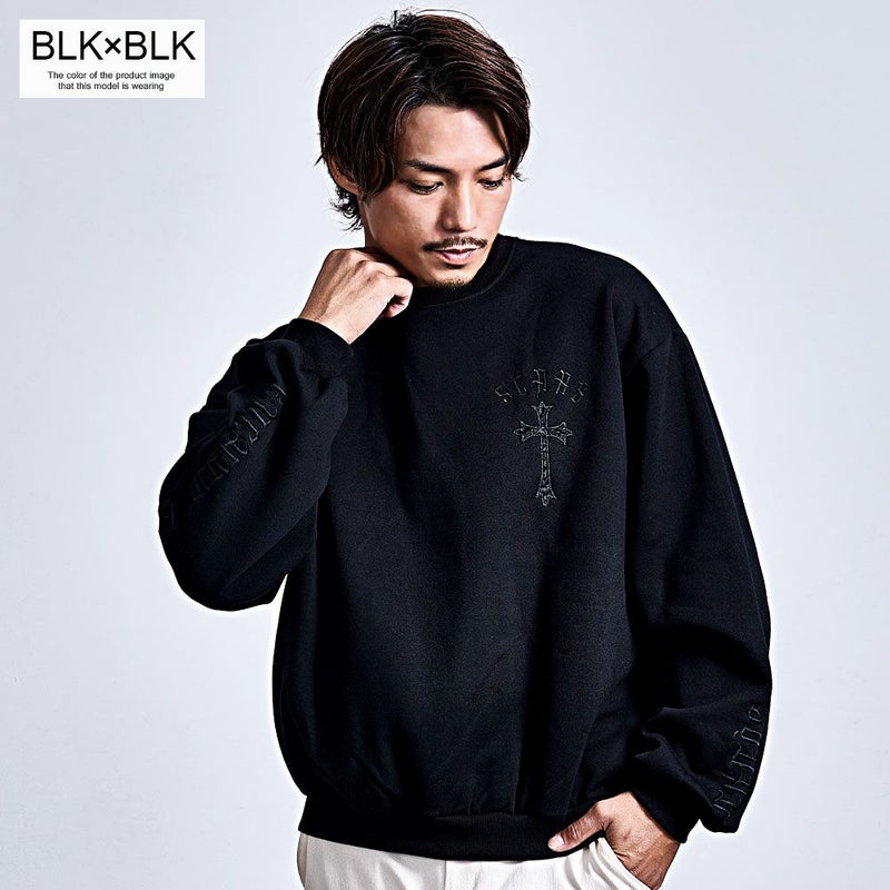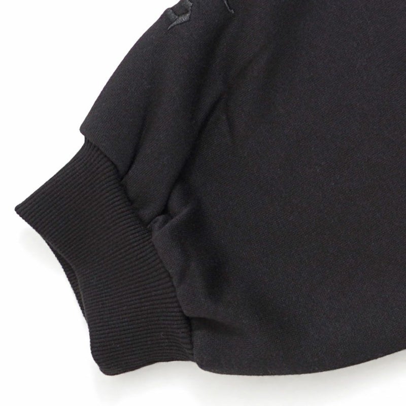 背面と左胸に施されたペイズリークロスのアップリケ刺繍が印象的で、ブラックのボディに浮かび上がる立体感がモードな雰囲気を演出。