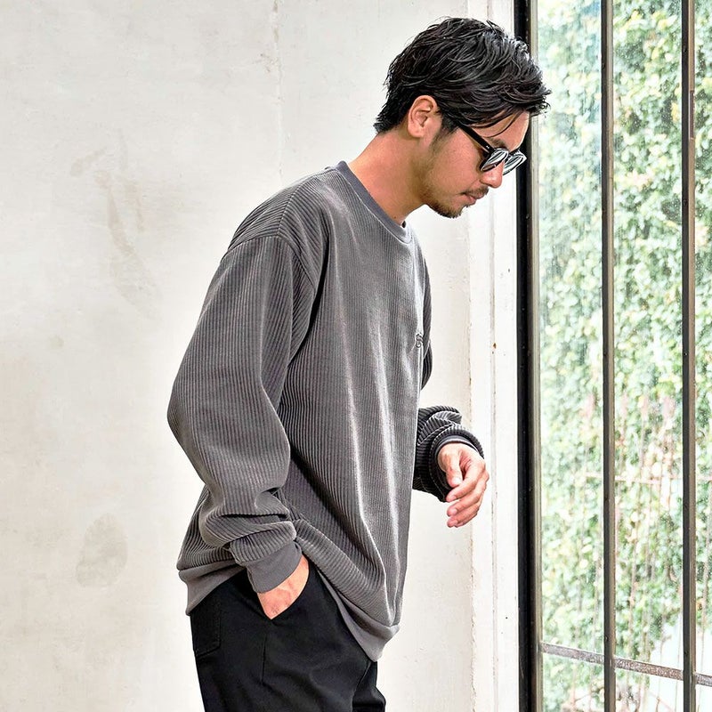 立体感のある畝(うね)が上品な表情を生み出し、カジュアルながらも落ち着いた印象を演出します。