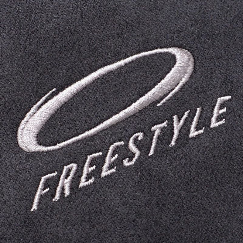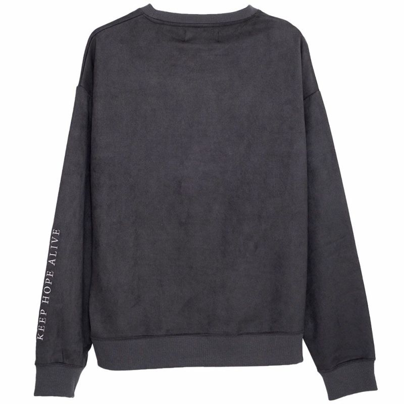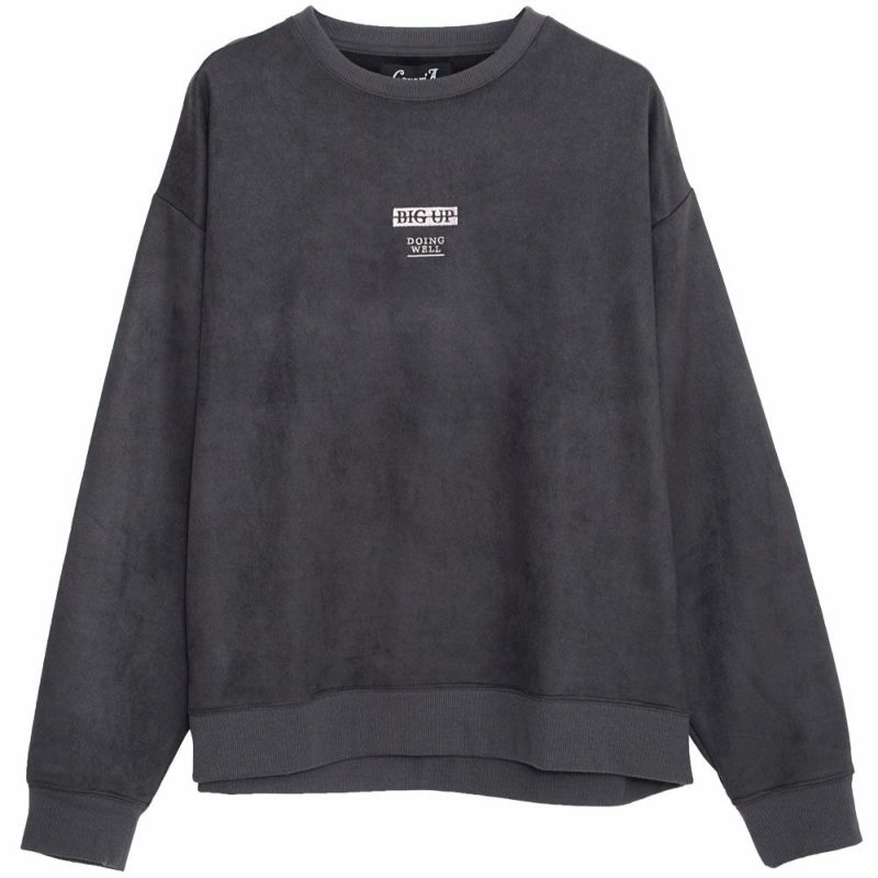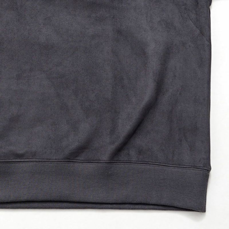 滑らかな肌触りのポンチスウェード素材に、フロントのロゴと左袖の刺繍がポイントに。