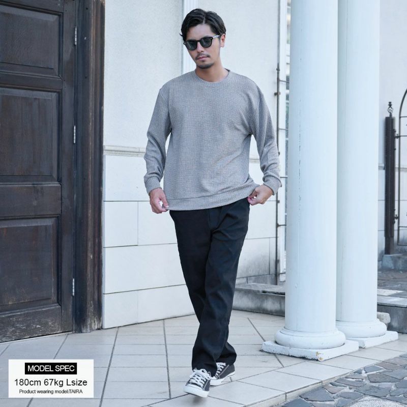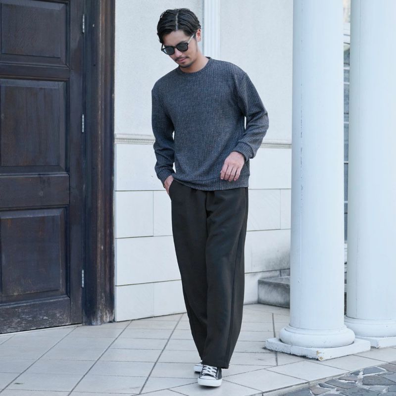 独特の凹凸感が特徴のワッフル編み素材を使用し、柔らかく伸縮性のある生地感で一日中快適に過ごせます。