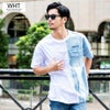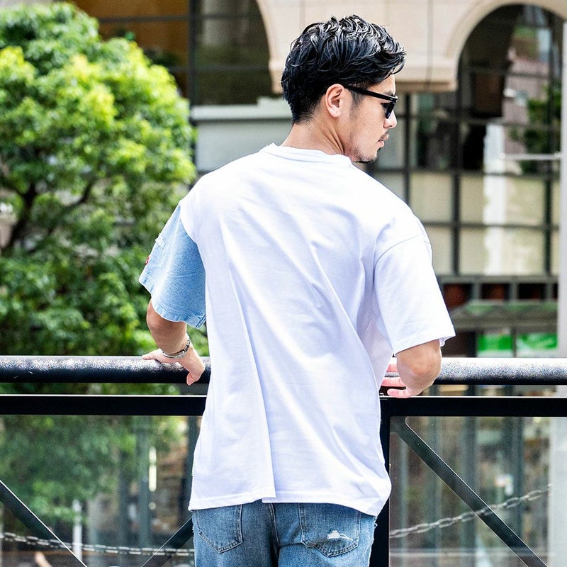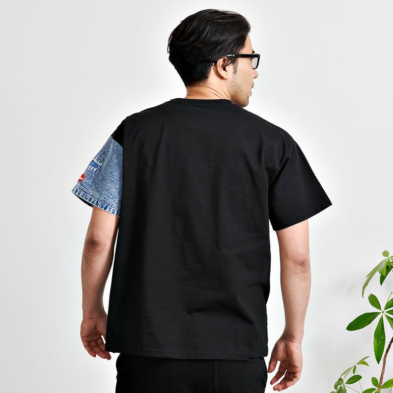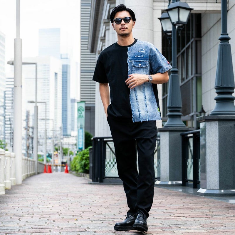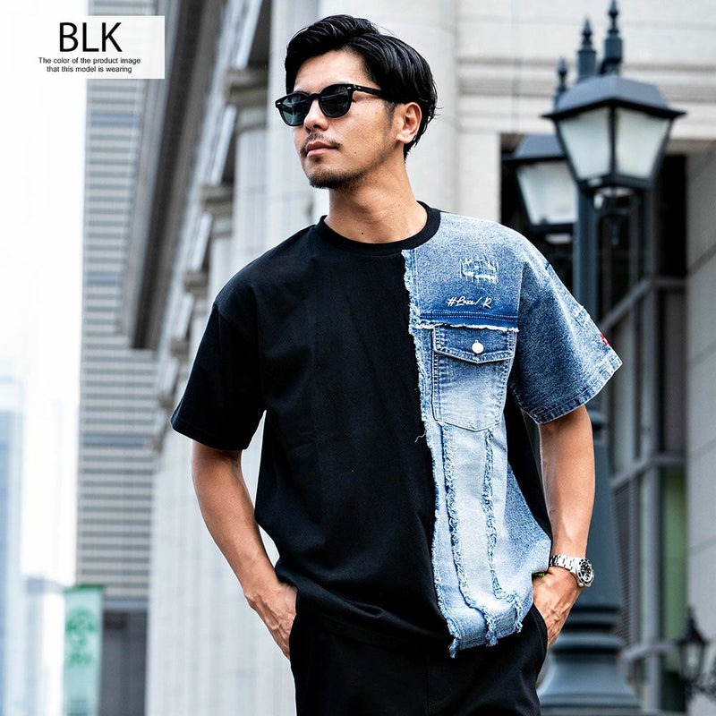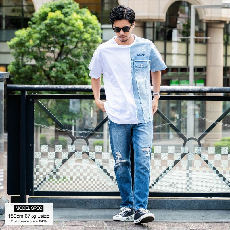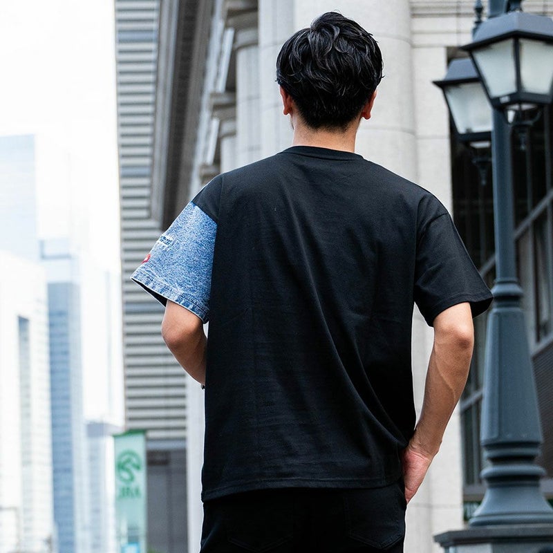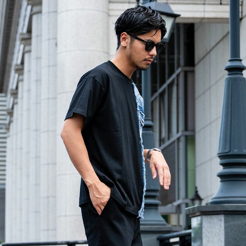 アシンメトリにデニム生地を切り替えたプラップポケット付きデザインのクルーネックTシャツ。