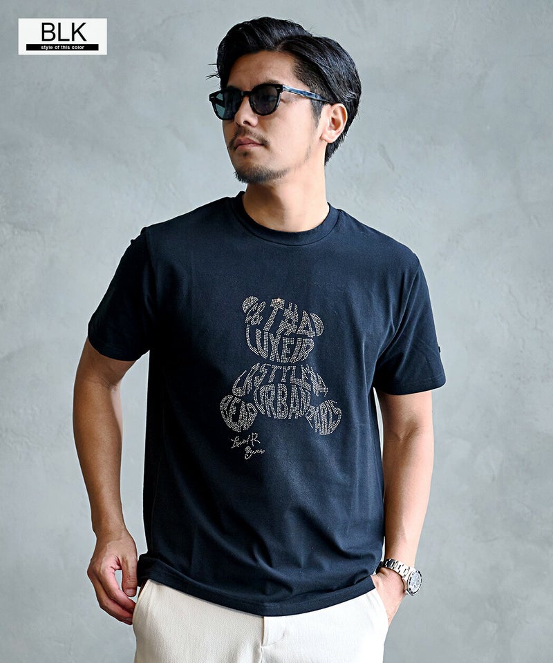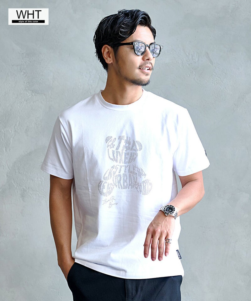 フロント全面に施されたラインストーンのベアデザインが目を引く、存在感抜群の半袖Tシャツ。