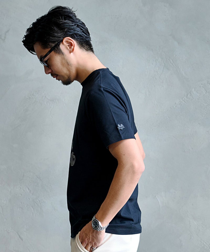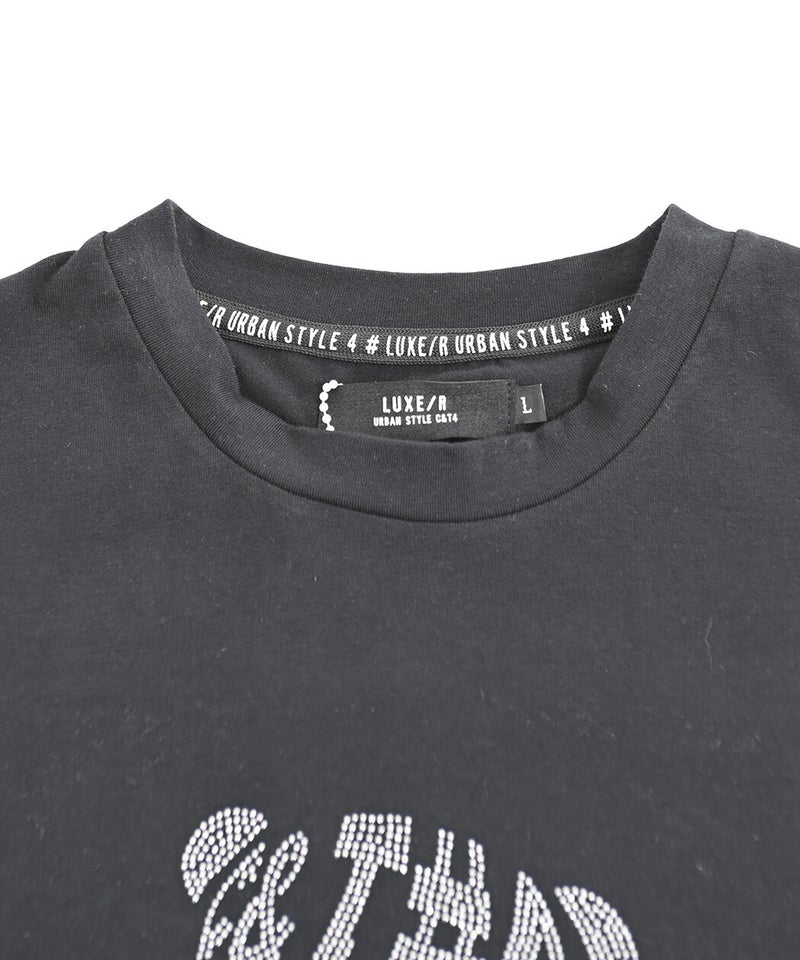 キラリと輝くラインストーンが立体的な表情を生み出し、シンプルなTシャツながらもコーディネートの主役として活躍してくれる一着です。