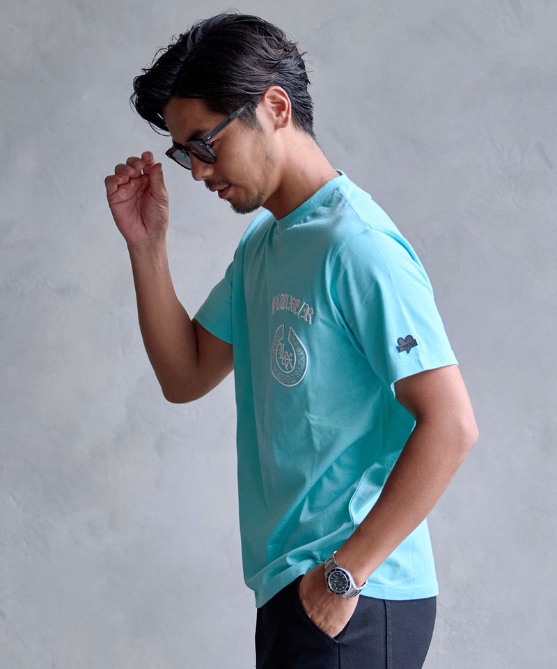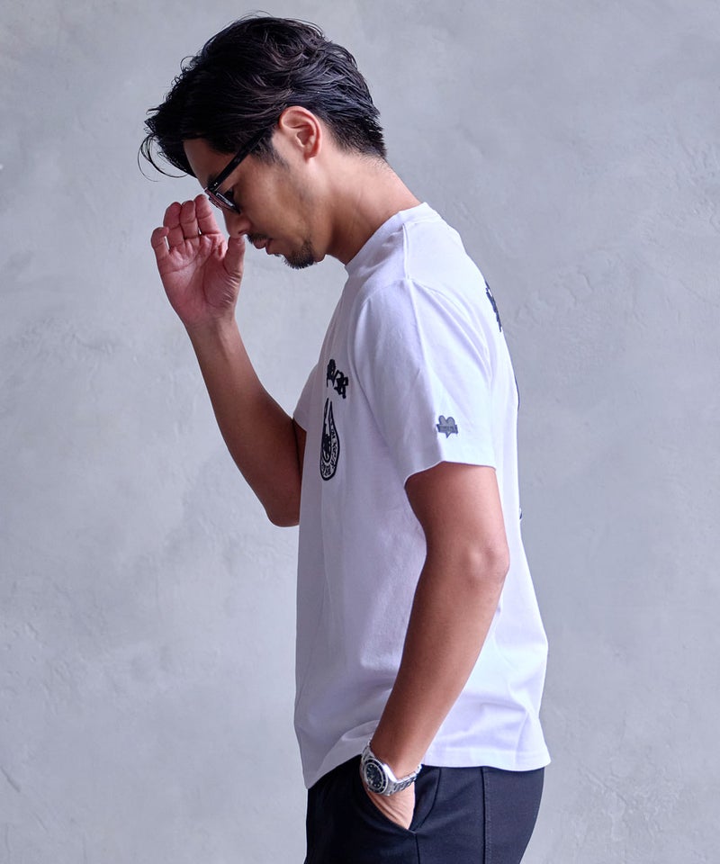 フロントに施されたアーチロゴと、立体感のあるコード刺繍が目を惹くデザインTシャツ。