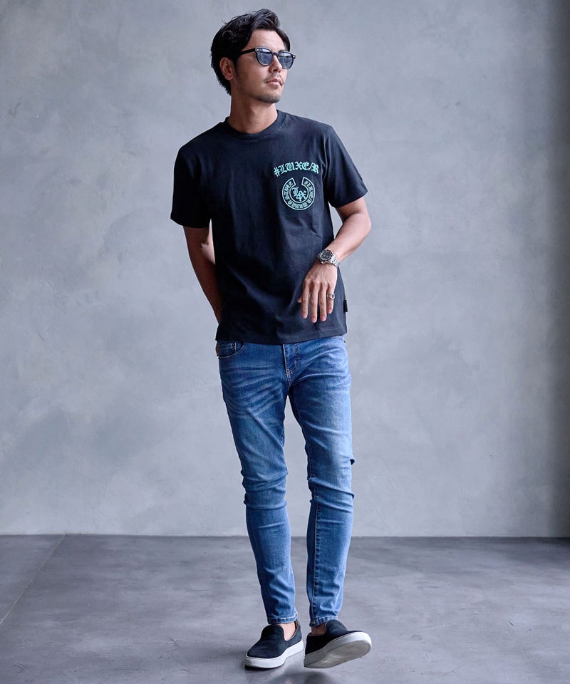 セットアップやデニム、プリント加工などのスタイリングを楽しむ。