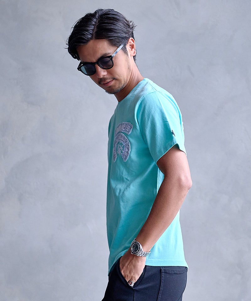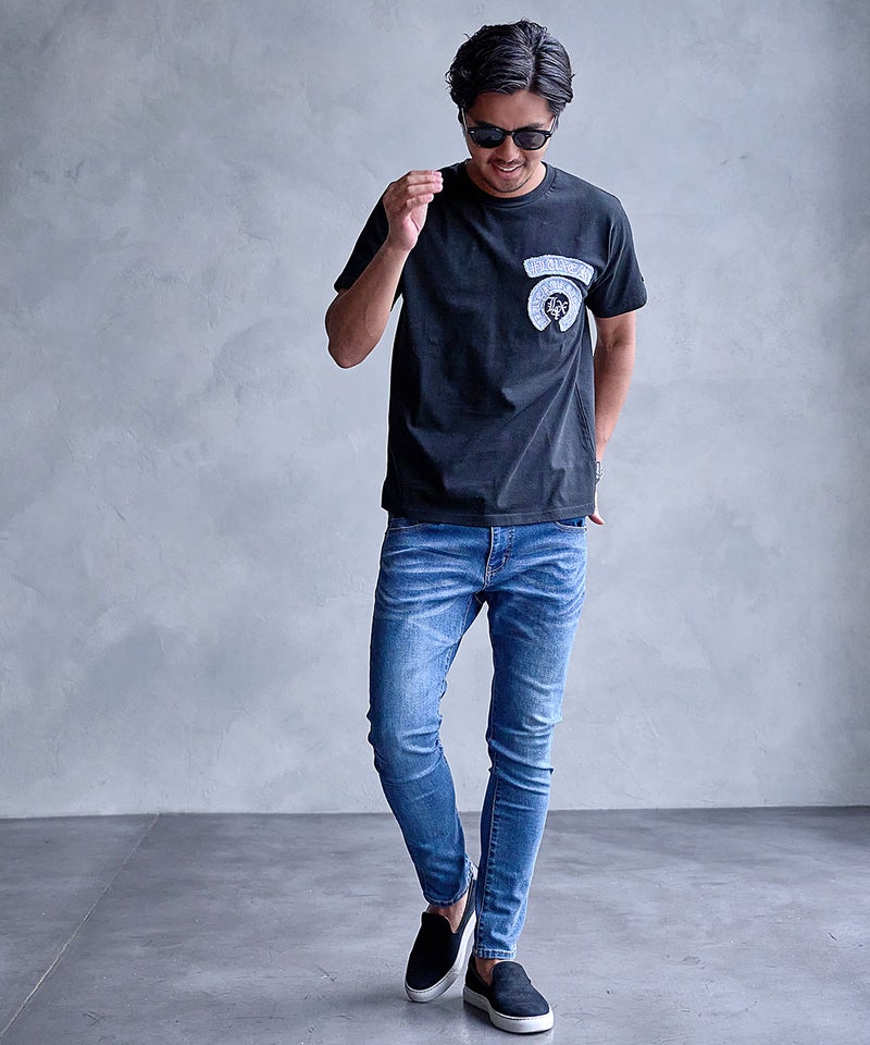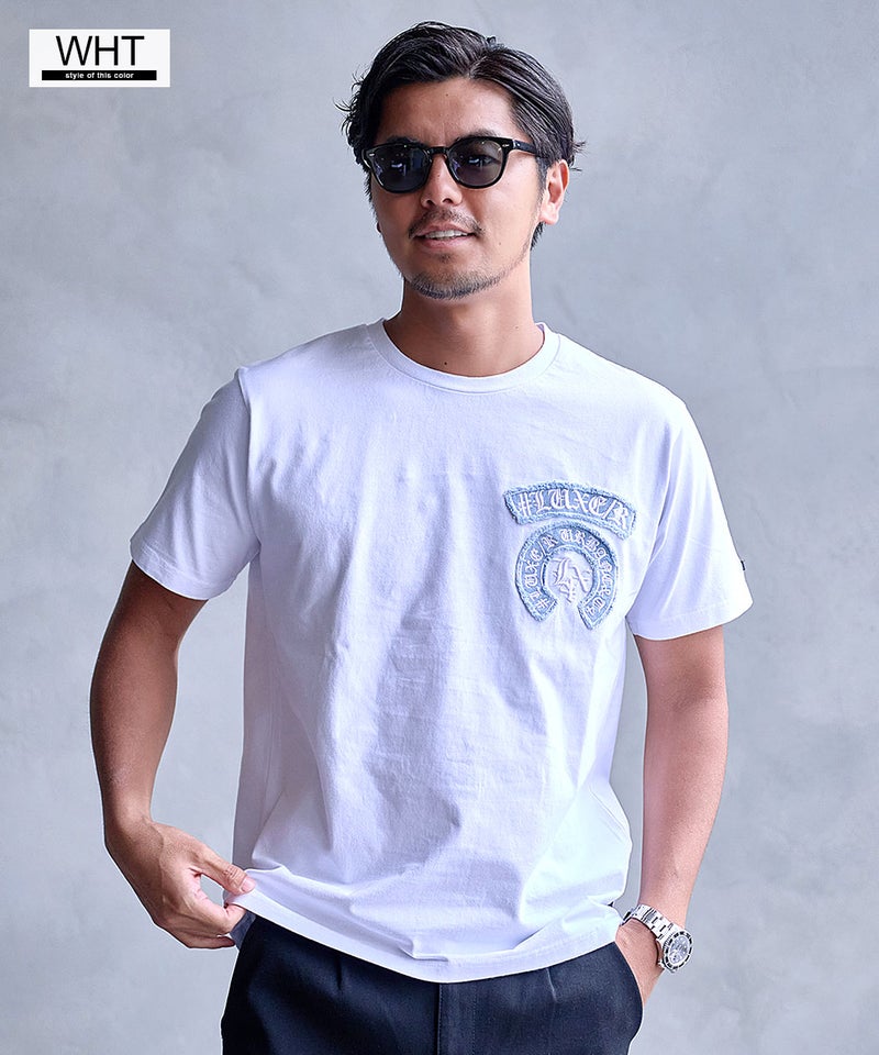 デニム素材を使用したアーチロゴが目を惹く、存在感のある半袖Tシャツ。