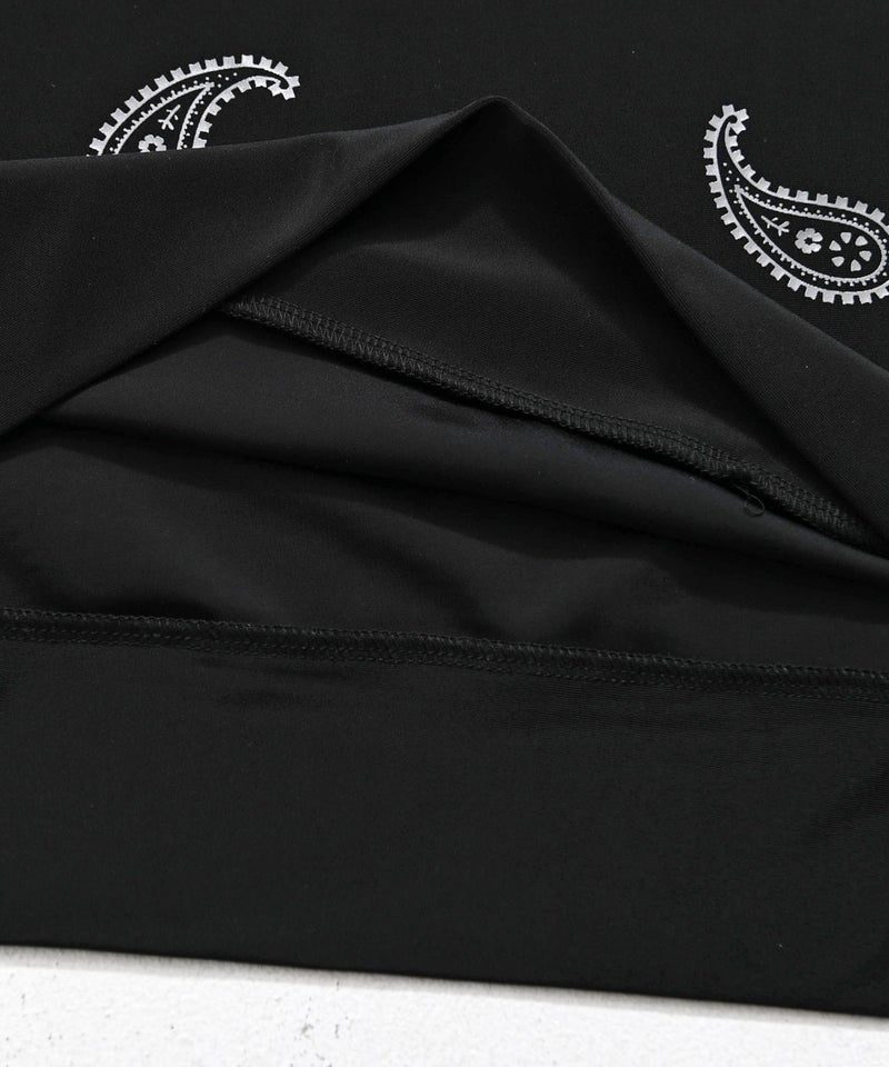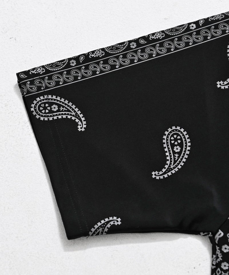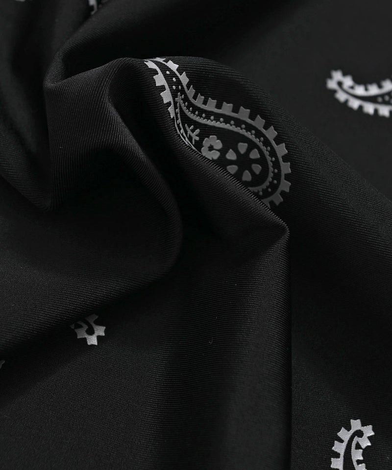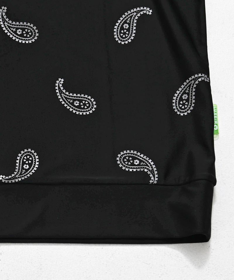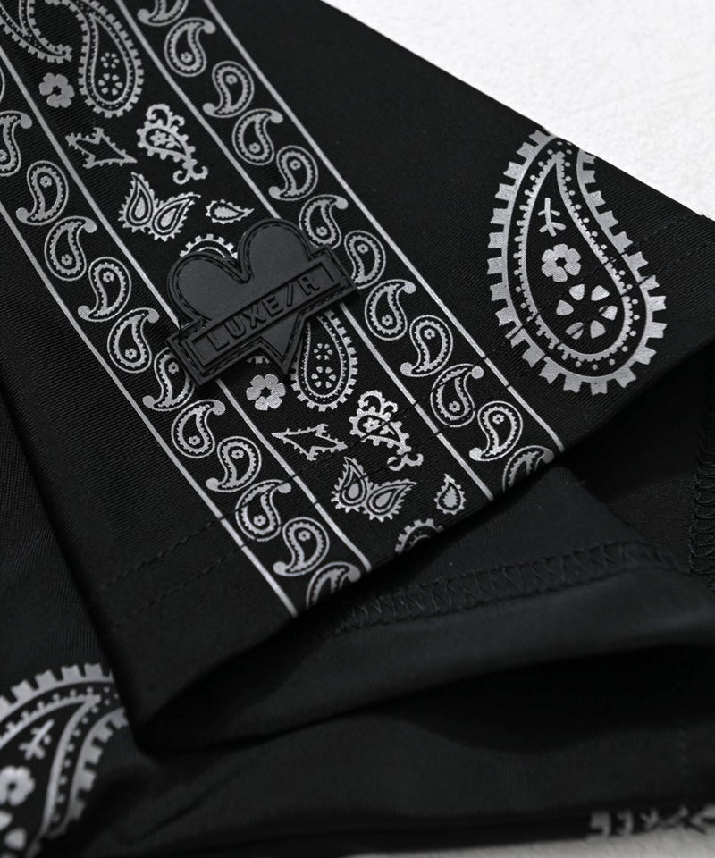 フロントにはロゴとペイズリー柄の切替デザインを配置し、シンプルながらも存在感のある仕上がりに。