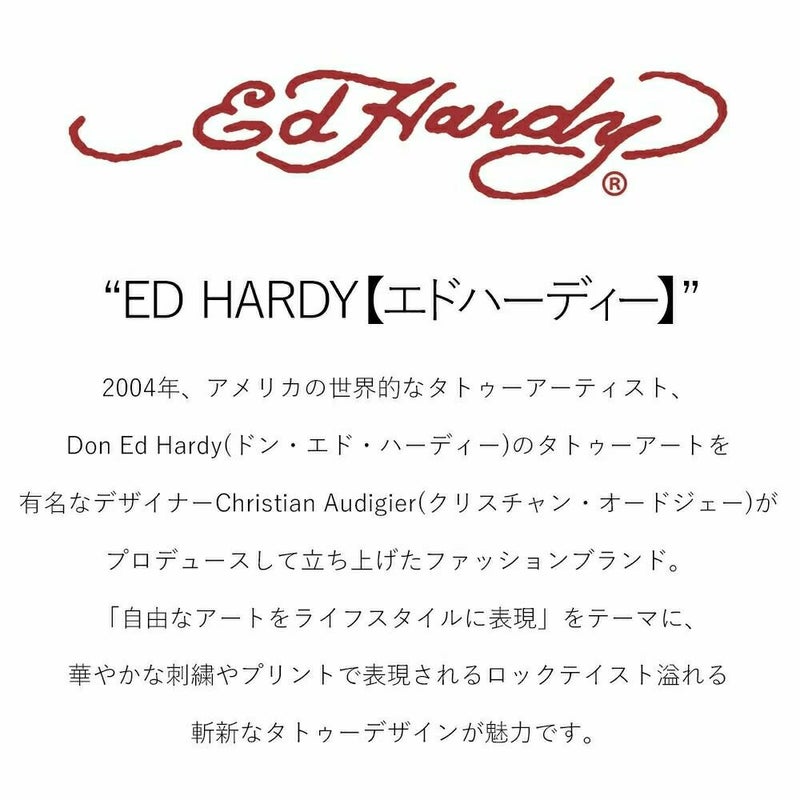2004年、アメリカの世界的なタトゥーアーティスト、Don Ed Hardy(ドン・エド・ハーディー)のタトゥーアートを有名なデザイナーchristian Audigier(クリスチャン・オードジェー)がプロデュースして立ち上げたファッションブランド。