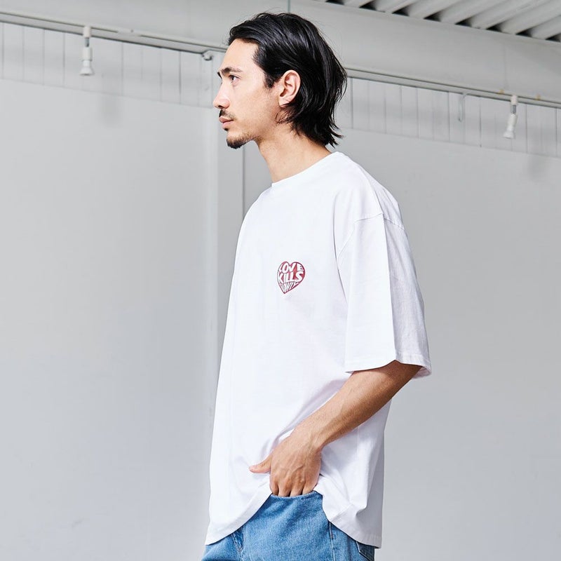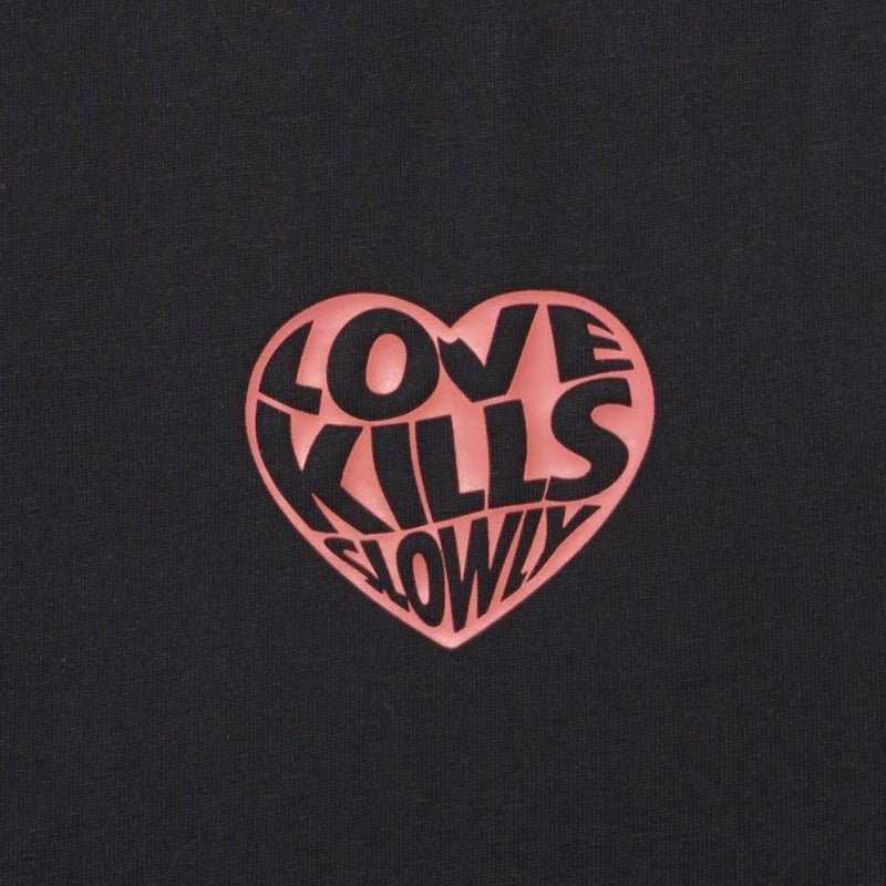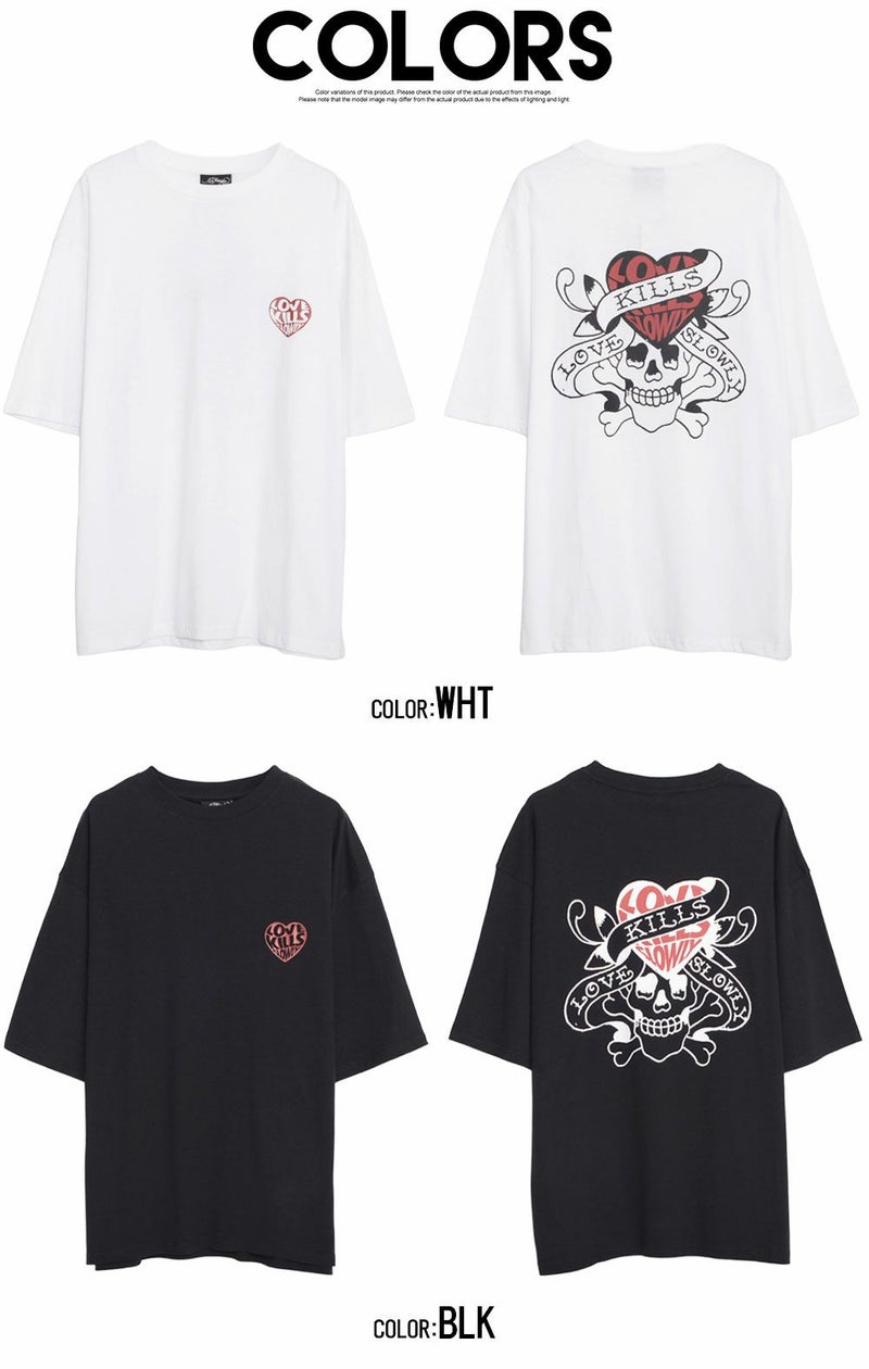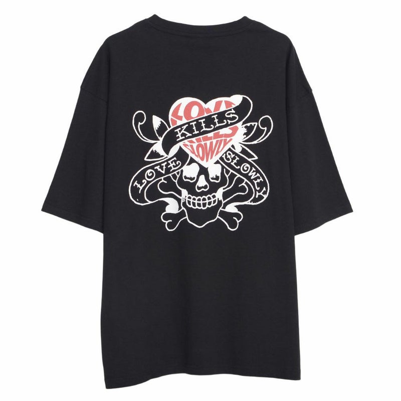 背面にはブランドを象徴するスカルやハートのモチーフを大胆にプリント。