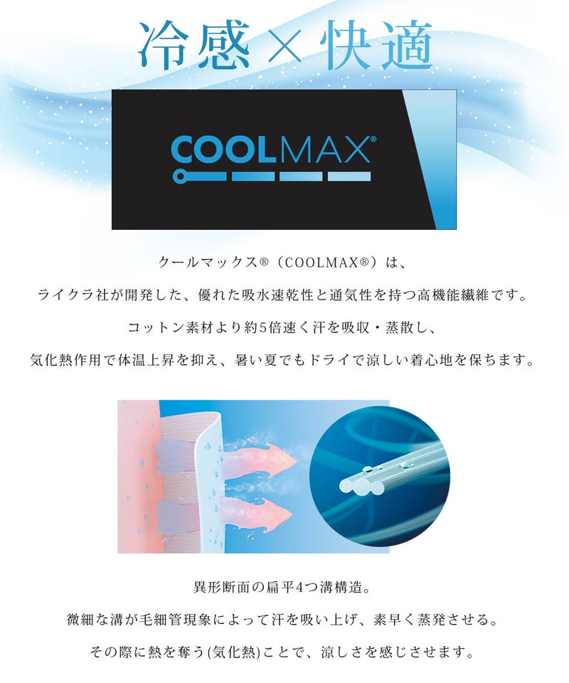 COOLMAXは、優れた吸湿速乾性と接触冷感機能を持ち、肌から汗を効率よく吸い取り、素早く発散することで、涼しくドライな着心地を保ちます。